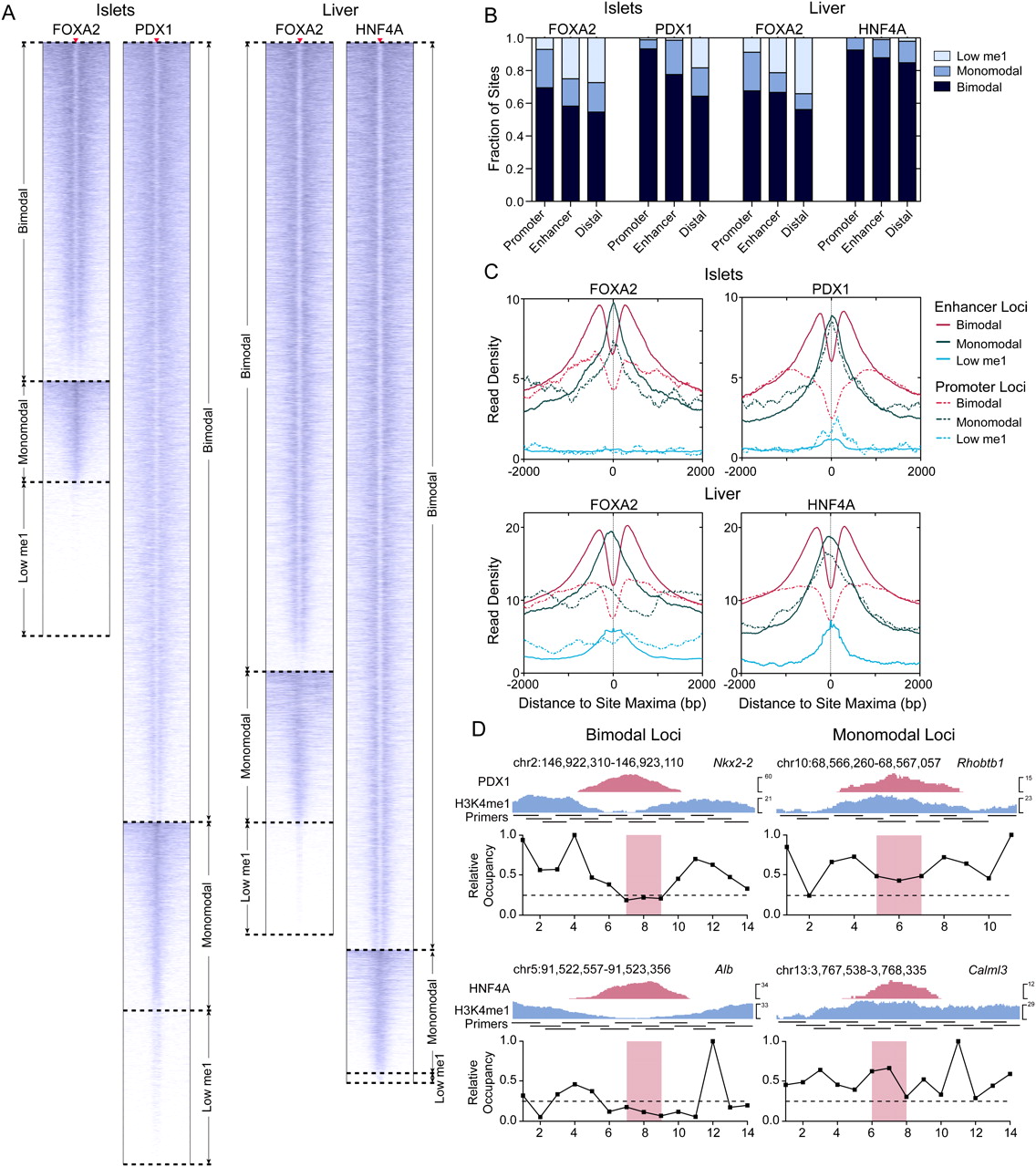 H3K4me1 profiles segregate discrete classes of transcription factor occupied loci. (A) Heatmaps of H3K4me1 read density in ±2-kb regions centered on FOXA2 (islets or liver), PDX1, and HNF4A peak maxima. Peak max locations are indicated by red triangles, with flanking H3K4me1 read density plotted horizontally in blue for each site. H3K4me1 read density is represented by the intensity of blue in the heatmaps: (dark blue) high; (light blue) low read density; (white) minimal or no H3K4me1. (B) Fractions of bimodal, monomodal, or low H3K4me1 promoter, enhancer, or distal (>50 kb from any RefSeq TSS) loci in each library. (C) Mean H3K4me1 enrichment profiles associated with promoter and enhancer loci in each site class in the FOXA2 (islets or liver), PDX1, and HNF4A peak sets. Peak maxima are centered at 0. (D) Nucleosome mapping by MNase-qPCR confirms the presence of nucleosomes. (Left) Flanking selected bimodal sites; (right) immediately at or adjacent to transcription factors binding locations at monomodal sites. UCSC Genome Browser screenshots of representative PDX1 (top panel) and HNF4A (bottom panels) loci are shown, and the locations of the primers used in the MNase-qPCR are indicated. The panels beneath the browser screenshots show MNase-qPCR results, with regions of relative enrichment indicative of nucleosome positions. The red-highlighted regions indicate the primer pairs flanking identified motif locations and represent the location of transcription factor binding; the dashed lines, at a relative occupancy of 0.25, are shown as a reference.