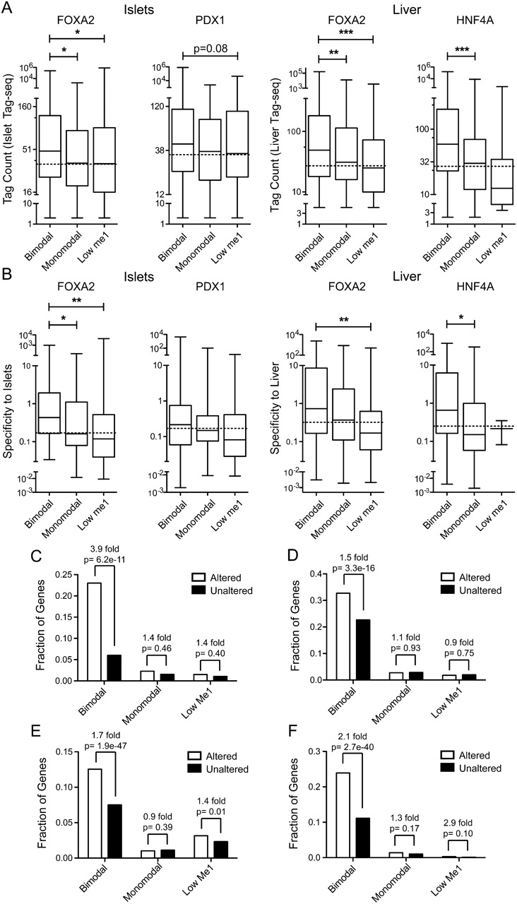 Bimodal sites regulate target gene expression. Box-whisker plots of islet or liver (A) Tag-seq counts or (B) specificity against 202 other mouse SAGE libraries, for expressed genes associated with a bimodal, monomodal, or low H3K4me1 site in the FOXA2 (islet or liver), PDX1, or HNF4A peak sets. Expressed genes have a tag count >5 in the particular Tag-seq library. Statistically significant differences were detected using a Kruskall-Wallis non-parametric test with a Dunn's multiple comparison correction, with a P < 0.05 threshold. (*) P < 0.05; (**) P < 0.01; (***) P < 0.001. Fractions of RefSeq genes with bimodal, monomodal, or low H3K4me1sites whose expression was significantly altered or not in (C) PancChip 6.1 (http://www.betacell.org/ma/) comparisons of Foxa2 deficient (Foxa2loxP/loxP, Pdx1-CreERT2, tamoxifen treated) versus control (Foxa2loxP/loxP, tamoxifen treated) islets (Gao et al. 2007). (D) Tag-seq analysis of islets treated with siRNA's targeting Pdx1 versus with siRNA's targeting Ppib. (E) Agilent 4×44k array comparisons of Foxa2 deficient (Foxa2loxP/loxP, Alfp-Cre) versus wild-type livers (Bochkis et al. 2009). (F) Agilent Whole Mouse Genome Microarray comparisons of Hnf4a deficient (Hnf4aloxP/loxP, Alb-Cre) versus wild-type livers (Holloway et al. 2008). P-values were determined using Fisher's exact test.