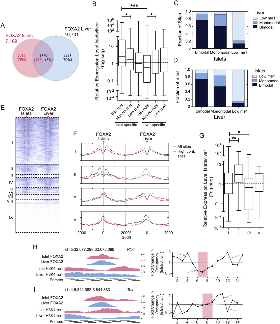 Tissue-specific FOXA2 binding and nucleosome occupancy determine tissue-specific target gene expression. (A) Venn diagram representing the proportion of sites shared between the FOXA2 islet and liver peak sets. (B) Box-whisker plot of the relative expression level (islets/liver) of expressed genes with associated islet- or liver-specific FOXA2 bimodal, monomodal, or low H3K4me1 sites. The fraction of FOXA2 sites shared in islets and liver that are bimodal, monomodal, or low H3K4me1 in the (C) FOXA2 islet or (D) liver peak sets. (E) A heatmap of H3K4me1 profiles in islets and liver for shared FOXA2 sites. Sites in group I are bimodal in both tissues; group II sites are bimodal in islet and monomodal in liver; groups III and VI–IX sites have low H3K4me1 (i.e., below the profile's global FDR threshold); group IV sites are islet monomodal and liver bimodal; and group V sites are islet and liver monomodal. (F) Profiles of average H3K4me1 read density for the shared site groups. Solid red lines are the average red densities for all peaks in a category, while dotted lines represent data from the high-confidence subset. (G) Box-whisker plot of the relative expression level (islets/liver) of expressed genes associated with peaks in groups I, II, IV, and V. Nucleosome mapping by MNase-qPCR confirms that nucleosome occupancy at transcription factor loci is altered at loci that are bimodal in islets and monomodal in liver (H), and vice versa (I). (Left) ChIP-seq enrichment profiles of the assessed loci, with the locations of the primers used for MNase-qPCR. (Right) Fold changes in nucleosome enrichment in islets/liver, calculated from MNase-qPCR results. Red arrows indicate regions that were specifically enriched for nucleosomes in islets, while blue arrows indicate regions that were specifically enriched for nucleosomes in liver. The red-highlighted regions indicate the primer pairs flanking identified FOXA2 binding motif locations and represent the relative location of FOXA2 binding. In B and G differences in expression were assessed using a Kruskall-Wallace non-parametric test with a Dunn's comparison. (*) P < 0.05; (***) P < 0.001.