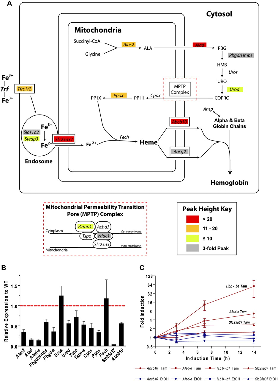 KLF1 directly regulates synthesis of heme and procurement of iron. (A) Schematic diagram of an erythroid cell simplistically depicting the pathways of heme synthesis, iron procurement, heme export, and hemoglobin assembly. Genes are shown in italics at their point of involvement in the pathways. The components of the mitochondrial permeability transition pore (MPTP) complex are shown in the inset for clarity. Genes in the figure are color coded as shown in the peak height key according to peak height from KLF1 ChIP-seq. (B) Relative gene expression in Klf1−/− fetal liver (compared with WT) for many of the genes depicted in A. Gene expression as determined by qRT-PCR is normalized to the housekeeping gene Hprt and shown for Klf1−/− fetal liver relative to WT (set to 1 as shown by the red dotted line). Data are presented as mean ± SEM. n ≥ 4 in each instance. (C) Relative gene expression in 4-hydroxytamoxifen (Tam)–induced K1-ER cells at 0, 3, 7, and 14 h following induction. Gene expression has been determined by qRT-PCR and normalized to the housekeeping gene Hprt. Induced gene expression (Tam, maroon) is shown together with the corresponding vehicle control (EtOH, blue) on a Log2 scale. Data are presented as mean ± SEM, n = 4.