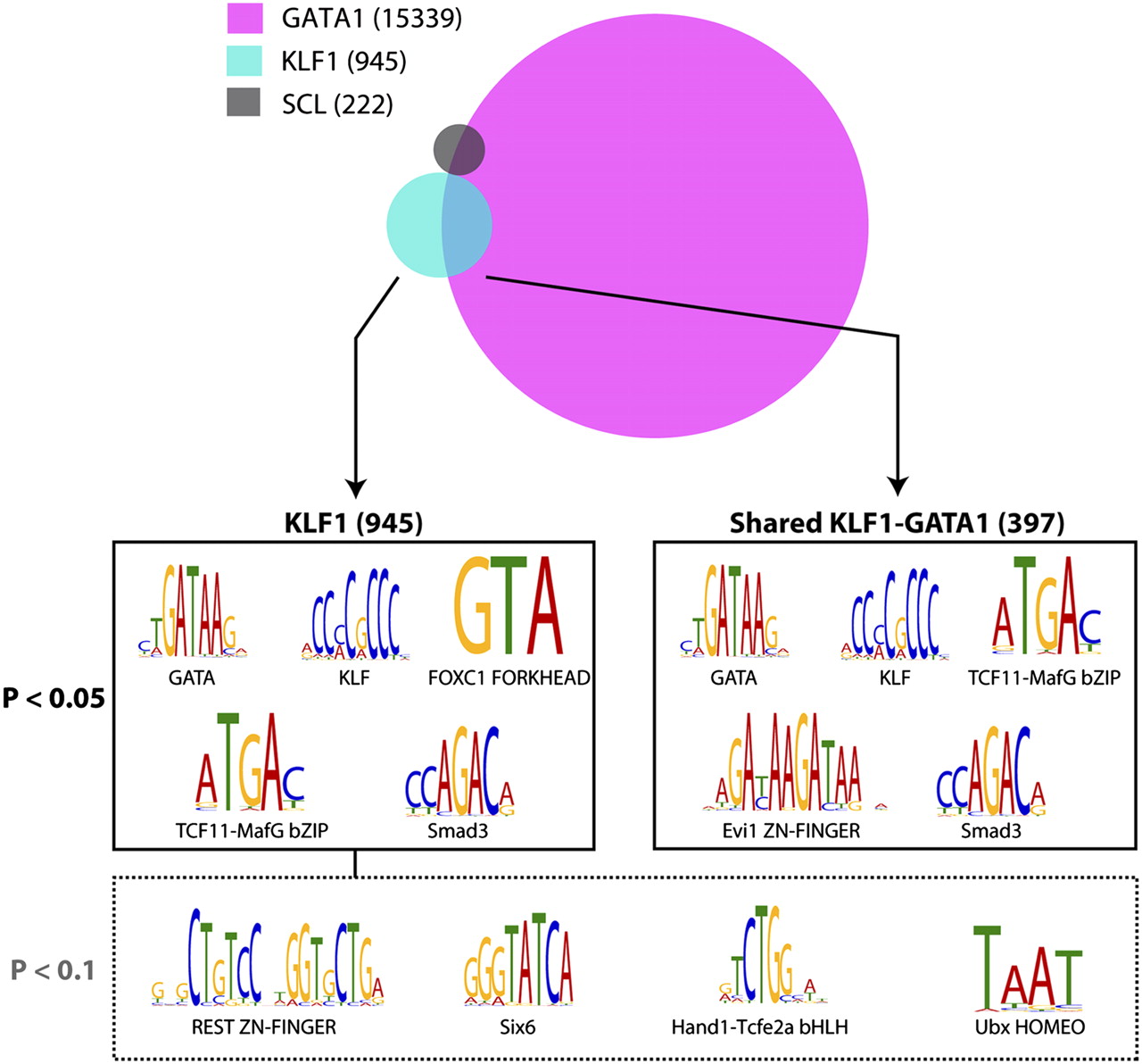 Analysis of KLF1- and GATA1-bound genomic regions reveals potential interacting transcription factor partners. A schematic representation of the overlap between KLF1, GATA1 (Cheng et al. 2009) and SCL (Wilson et al. 2009) erythroid ChIP-seq datasets defines two major groups of KLF1 binding sites, total binding sites (945), and shared KLF1-GATA1 binding sites (397). Interrogation of binding site sequences using the Clover algorithm identifies the motifs shown as being overrepresented in the groups shown at 0.05 and 0.1 P-value significance levels.