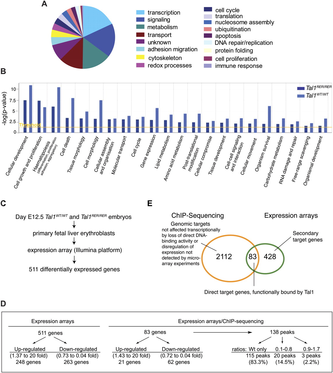 Combining ChIP-seq data with gene expression analyses. (A) Pie chart showing the distribution of the genes identified as candidate targets of TAL1 in Tal1WT/WT fetal liver cells according to their GO. (B) Highly enriched functional categories (1.1 × 10−11 < P-values < 0.05) were identified in the gene sets characterized from Tal1WT/WT and Tal1RER/RER samples using Ingenuity software. The Ingenuity Knowledge Base served as background population and the Fisher's exact test was used. The threshold corresponds to a P-value of 0.05. (C) Microarray analysis: outline of the experimental strategy. (D) Characteristics of genes revealed by expression arrays (511) and those identified in the intersection with ChIP-seq data (83). See text for details. (E) Venn diagram showing the overlap between the genes detected by ChIP-seq and those revealed by expression array.