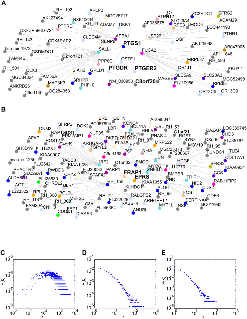Network topology. (A) Subnetwork of gene COX1 (PTGS1) and all genes up to two edges away at FDR <10−6. (B) Subnetwork of gene MTOR (FRAP1) and all genes up to three edges away at FDR <10−8. (C) Degree distribution of fully combined RH network at FDR <5%. Number of degrees, k, and point probability of node with k degrees, P(k), plotted on log scales. (D) Degree distribution of HPRD network. (E) Degree distribution of fully combined RH network at FDR <10−8.