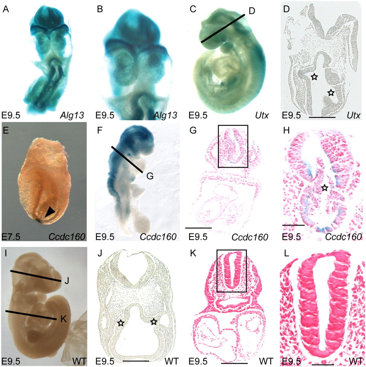 Novel embryonic phenotypes. (A,B) Alg13 mutants have widespread expression of the lacZ reporter, are severely developmentally delayed, and have cardia bifida. (C) Kdm6a mutant embryos have an open head and lacZ reporter expression in the head and neural tube. (D) Histological analysis of heads of Kdm6a mutants shows a fused forebrain and uneven, delayed optic pits (stars), compared with a similar region in a stage-matched control embryo (J). (E) Ccdc160 mutant embryos have expression in the node at E7.5. (F) At E9.5, expression of Ccdc160 has become highly restricted to the developing brain and neural tube. (G) Histological analysis of an E9.5 Ccdc160 mutant embryo revealed the presence of cells in the lumen of the neural tube; this was observed in three out of three embryos examined (data not shown). (H) Closer view of the neural tube in G highlighting the trapped cells (star). (I) A wild-type E9.5 embryo has a single folded heart and closed head. (J) Histological section of the head of an E9.5 wild-type embryo showing segmented developing brain and symmetrical optic pits (stars). (K) Histological section though a wild-type E9.5 embryo showing normal number of developing chambers and a closed neural tube with an empty lumen (star). (L) Higher magnification view of neural tube in K.