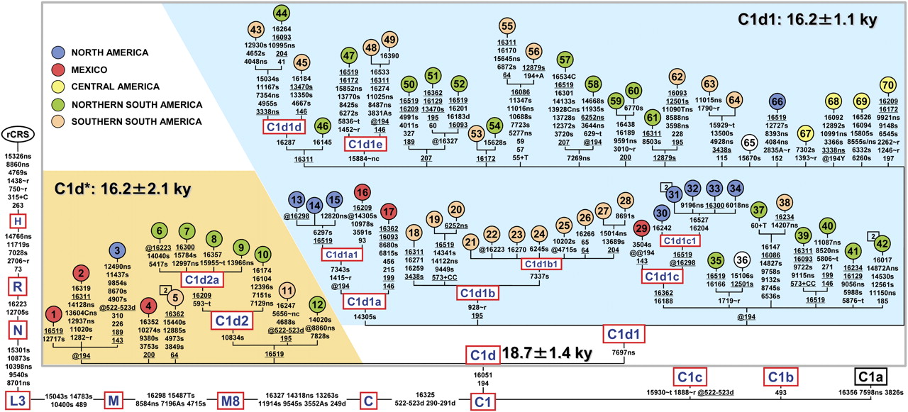 Detailed tree of C1d in the context of haplogroup C1. All 73 C1d mtDNA sequences (63 novel and 10 published) are complete except for samples 36 and 65, for which only coding-region data are available. The basal motifs for Native American haplogroups C1b and C1c are also included together with the motif of the Asian-specific branch C1a. The position of the revised Cambridge reference sequence (rCRS) (Andrews et al. 1999) is indicated for reading off-sequence motifs. Mutations are shown on the branches; they are transitions unless a base is explicitly indicated. The prefix @ designates reversions, while suffixes indicate transversions (to A, G, C, or T), indels (+, d), gene locus (∼t, tRNA; ∼r, rRNA; ∼nc, noncoding region outside of the control-region), synonymous or nonsynonymous changes (s or ns), and T/C heteroplasmy (Y). Recurrent mutations within the phylogeny are underlined. We have followed the guidelines for standardization of the alignment in long C stretches (Bandelt and Parson 2008), but disregarded any length variation in the C-stretch between nucleotides 303 and 315, with the exception of the well-known 315+C insertion. Additional information regarding each mtDNA is available in Supplemental Table S1. Coalescence times shown for C1d, C1d*, and C1d1 are maximum-likelihood (ML) estimates, while the corresponding averaged distance (ρ) accompanied by a heuristic estimate of SE (σ) are shown in Table 1. As for the geographic affiliation (top left corner), North America refers to USA and Canada; northern South America refers to Colombia, Venezuela, Ecuador, Peru, and Brazil; southern South America corresponds to Chile, Argentina, Uruguay, and Paraguay.