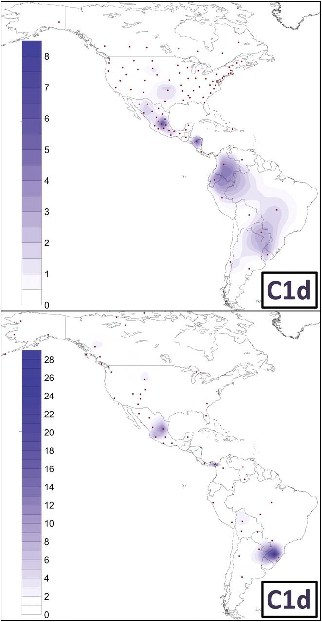 Spatial frequency distribution of haplogroup C1d. The top map shows the frequency distribution of haplogroup C1d in general mixed populations of national states, while the bottom map illustrates the distribution in Native American tribes or communities. Note that the frequency scales (%) used in the two maps are different. The dots indicate the geographic location of the population samples included in each survey (Supplemental Tables S2, S3). Frequency maps were obtained as in Pala et al. (2009).