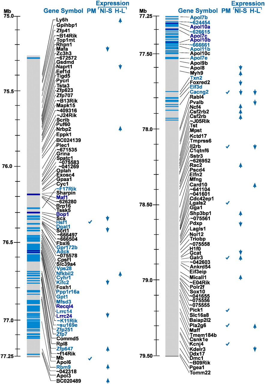 Integrative analysis of the 155 genes within the Pain1-containing interval. The gene names and their location on mouse chromosome 15 are shown on the left gray bar. (Blue bars) SNPs with a complete cosegregation among the seven mouse strains (see text); (dark blue bars) coding nonsynonymous SNPs; (light blue) other SNPs. Predicted/annotated genes and hypothetical protein names (long names) are given as “∼xxxxxx” (where xxxxxx is the six last characters of the gene name). For the full name, see Supplemental Table S3. The column “PM” indicates genes found to be related to pain physiology in a PubMed search. The columns “NI-S” (NI, nerve-injured; S, sham) and “H-L” (H, high autotomy; L, low autotomy) highlight genes with significant expression-fold change (the direction of the arrowheads indicates up-regulation or down-regulation). The “NI-S” column presents the results for the nerve-injured versus sham comparison, and the “H-L” column presents the results for the high-autotomy versus the low-autotomy strains.