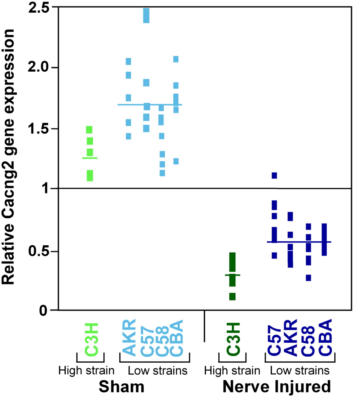 Cacng2 gene expression. For each mouse, the relative gene expression value at Cacng2 is shown (transcript 1440210_at/#BB342913). This is the expression value in a given mouse divided by the mean expression value across all mice. Results for the high autotomy strain C3H are shown for sham operated mice (light green) and nerve-injured mice (dark green). Results for the low autotomy strains C58, C57, CBA, and AKR are shown for sham-operated mice (light blue) and nerve-injured mice (dark blue). The Cacng2 expression average for each group is represented by a horizontal line. For reference, the horizontal line drawn at 1 represents the mean Cacng2 expression level of all mice.