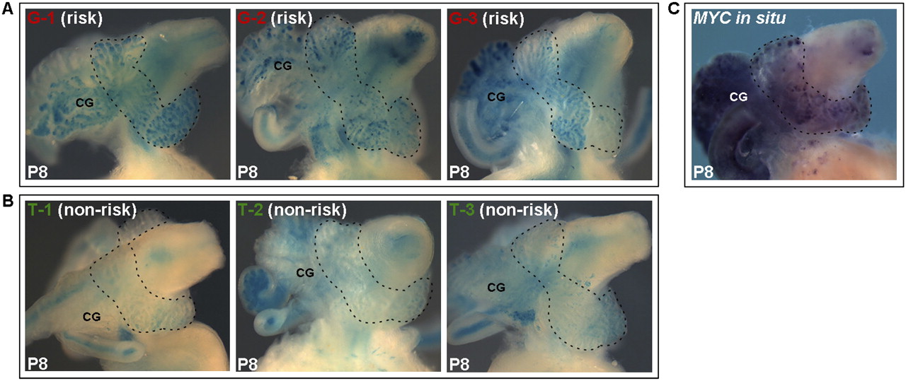 SNP rs6983267 mediates allelic-specific enhancer activity in mouse prostates. Three independent transgenic founders harboring reporter plasmids driven by either the G (risk) allele (A) or T (non-risk) allele (B) are shown at P8. (Dashed lines) Outlines of prostates; (CG) coagulating glands. The prostate cancer risk allele leads to consistently stronger beta-galactosidase expression in prostates and coagulating glands than the non-risk allele in vivo. (C) MYC in situ hybridization at P8 correlates with the reporter expression pattern driven by the rs6983267-containing enhancer.
