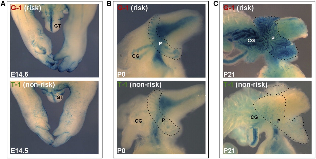 The rs6983267-containing enhancer demonstrates distinct temporal regulatory abilities. Representative G (risk, top) and T (non-risk, bottom) transgenics are shown at a series of developmental time points. (A) E14.5 transgenic embryos exhibit beta-galactosidase expression in the genital tubercle and limbs, with no apparent allele-specific enhancer activity. (GT) Genital tubercle. (B,C) Allele-specific regulatory ability is visible in neonatal P0 pups (B) and P21 adolescent mice (C), with in vivo prostate and coagulating gland beta-galactosidase expression qualitatively stronger in the risk allele (top) line than the non-risk variant (bottom). (CG) Coagulating gland, (P) prostate.