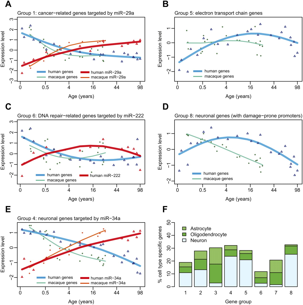 Functions, regulation, and specificity of coexpressed gene groups. Shown are mean expression profiles of selected genes within coexpressed gene groups, and their putative miRNA regulators. The empty triangles show mean standardized (z-transformed) human mRNA (blue) and miRNA (red) expression levels, while empty circles show mean standardized macaque mRNA (green) and miRNA (orange) expression levels (note the differences in timing of expression changes between human and macaque, for both mRNA and miRNA expression). The x-axis shows age of individuals on the (age)¼ scale. The lines correspond to cubic spline curves. The depicted genes are associated with specific Gene Ontology functional terms significantly enriched within the given coexpressed group. For A, C, and E, the genes are further targeted by specific miRNAs. (A) miR-29a and its four cancer-related targets in group 1 (MMP2, TRAF4, COL4A2, COL4A1). (B) Seventeen genes involved in electron transport in group 5. (C) miR-222 and its target in group 6, REV1, involved in DNA damage repair. (D) Fifty-seven neuronal genes in group 8. (E) miR-34a and its seven target neuronal genes in group 4 (GREM2, CAMSAP1, TANC2, CALN1, RGMB, FKBP1B, RTN4RL1). (F) Cell-type specificity of gene groups. The y-axis shows the percentage of cell-type-specific genes among the eight coexpressed age-related gene groups (based on Cahoy et al. 2008; see Methods).