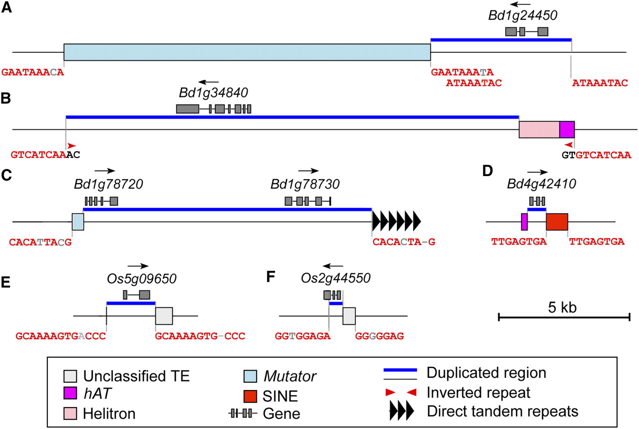Molecular signatures that point to DSB repair as the cause of gene movement. (Red) Target site duplications (TSDs) that were produced upon the insertion of transposable elements; (gray) mismatches. The double-strand break (DSB) induced by the transposable element insertion occurred within a few base pairs of the terminus of the transposable element. A model for the molecular events that led to the situation in A is given in Figure 6. Depending on the precise location of the DSB, TSDs are flanking the transposable element (C–E), the duplicated region (B,F), or both (A). The example in C is flanked on one side by an array of direct repeats. It is possible that a combination of the TE insertion and the presence of the repeat array lead to the DSB (see also Fig. 5).