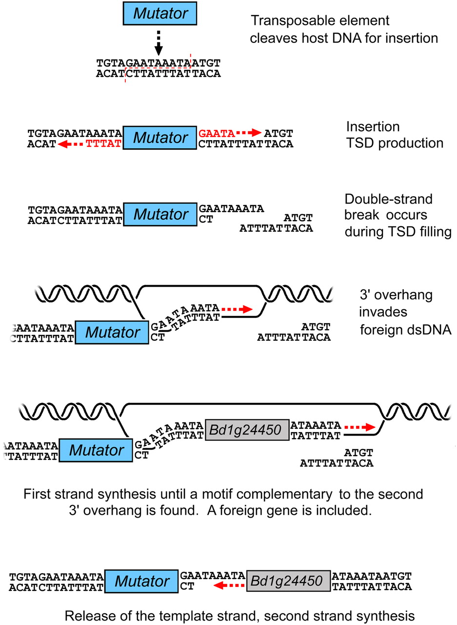 Model for molecular events that led to a duplication of gene Bd1g24450. A DSB is introduced after the insertion of a Mutator element in the genome. A sequence fragment from elsewhere in the genome containing gene Bd1g24450 is used as filler DNA to repair the DSB.
