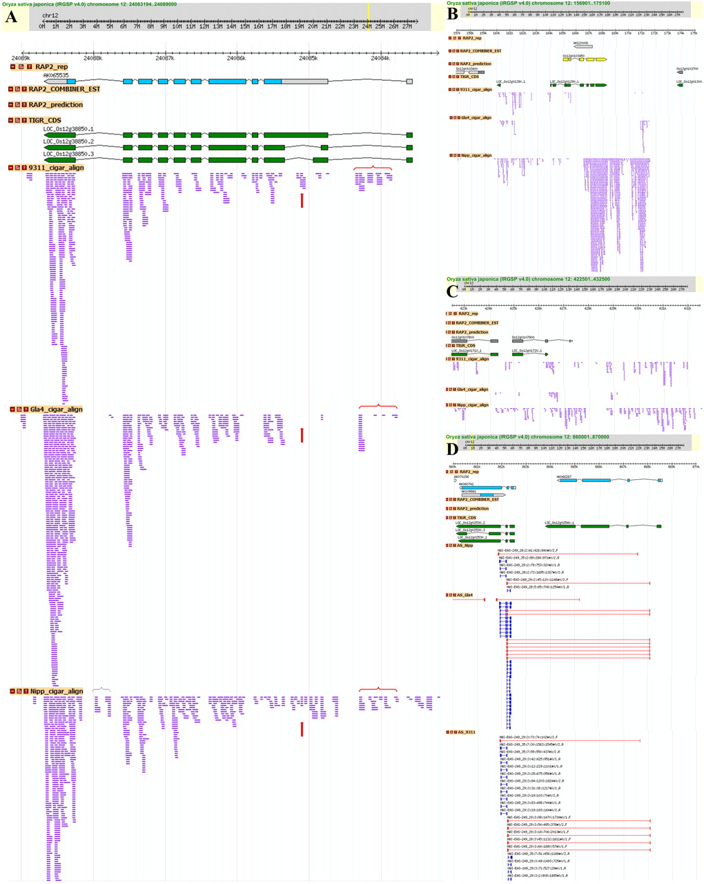 Examples of identified novel AS patterns and nTARs. (A) Novel exons (brackets) and alternative exons (vertical arrows) in the LOC_Os12g38850 transcript among 93-11, Guangluai 4, and Nipponbare are shown. Exons (filled boxes and horizontal arrows) and introns (lines) predicted by gene models (RAP2 and TIGR) were indicated. The RNA-seq short reads were indicated by purple lines. (B) Strong transcriptional activity was detected by the RNA-seq reads (purple lines) in the Nipponbare nearby gene LOC_Os12g01290. (C) nTARs identified by RNA-seq reads (purple lines) in Nipponbare and 93-11 as compared with the gene prediction models. (D) Novel exon–exon splicing junctions were identified in the three varieties.