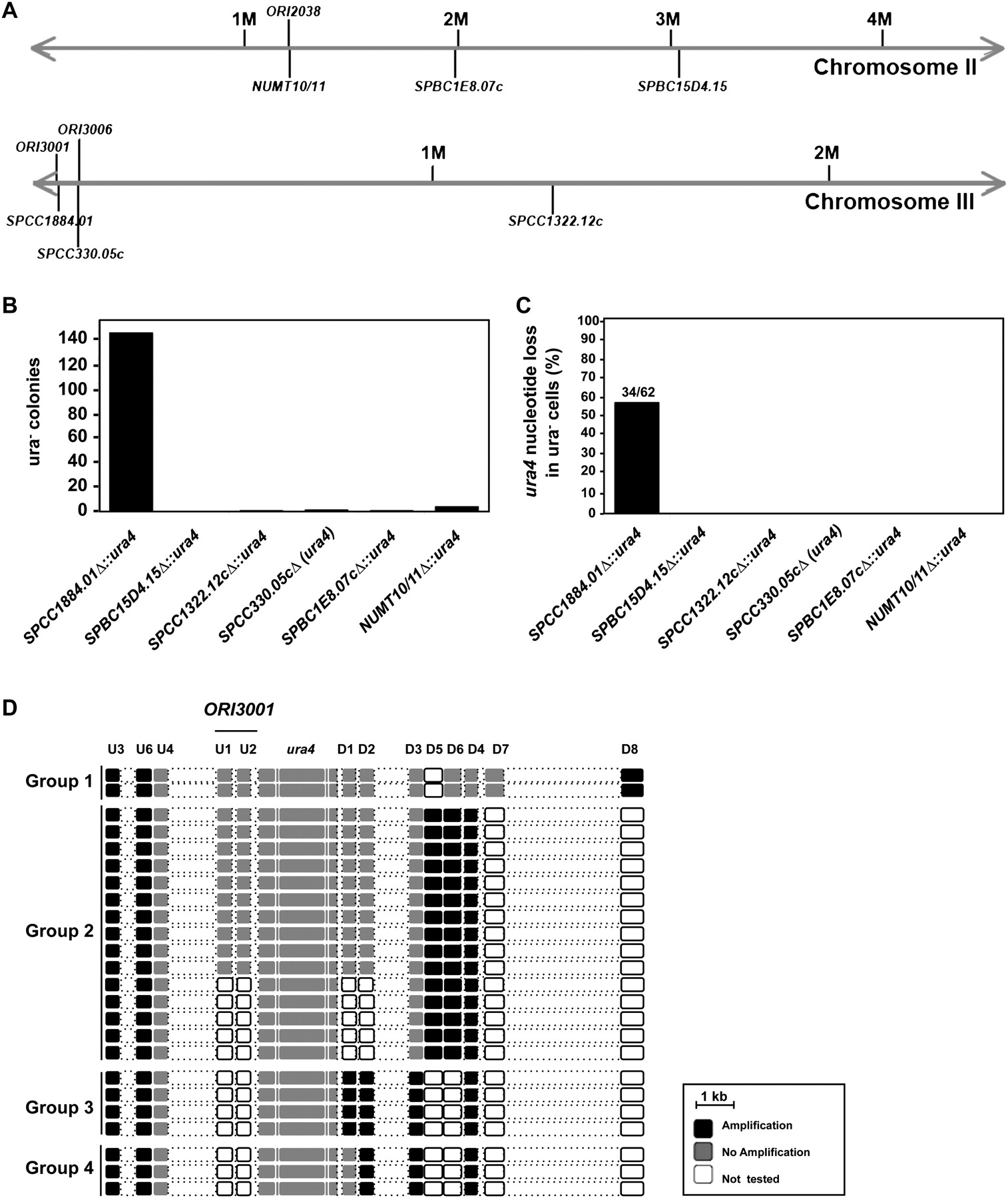 Replication stress induces frequent nucleotide deletion events at subtelomeric ORI3001 locus. (A) An expression cassette comprising the ura4 gene was inserted at five distinct chromosomal loci in S. pombe to give AD549 (SPCC1884.01Δ∷ura4), AD496 (SPBC1E8.07cΔ∷ura4), AD555 (NUMT10/11Δ∷ura4), PN4095 (SPCC1322.12cΔ∷ura4), and AD421 (SPBC15D4.15Δ∷ura4) strains. AD467 strain has an endogenous WT ura4 gene (SPCC330.05c). Positions of ORI3001, ORI3006, and ORI2038 were deduced from the peaks of Mcm6 binding onto chromatin obtained by Hayashi et al. (2007) (Supplemental Fig. 7) and the data from Heichinger et al. (2006). The nomenclature used for ORIs comes from (Heichinger et al. 2006). (B) pREP3x∷cdc18 plasmid was introduced into all six S. pombe strains. Cdc18 overexpression was achieved by incubating cells for 19 h at 32°C in the absence of thiamin. Cells (0.5 × 109) were then plated onto 5-FOA-containing EMM2 agar plates (50 × 106 cells/plate) and the 5-FOAR colonies that were recovered after 4–6 d were tested for uracil auxotrophy. The graph gives the number of ura− colonies that were obtained for each strain. (C) The ura− colonies recovered in B were tested for the presence of the ura4 gene by PCR screen. (D) The extent of genomic DNA deletion was analyzed by PCR in 24 colonies with the ura4 deletion derived from the SPCC1884.01Δ∷ura4 strain. Each box represents a PCR product (see Supplemental Table III for primers). In ura− mutants, PCR products were either recovered (black boxes) or not (gray boxes). White boxes indicate regions that were not tested by PCR. The mutants were classified into four groups according to the extent of genomic DNA deletion. The position of ORI3001 is indicated.