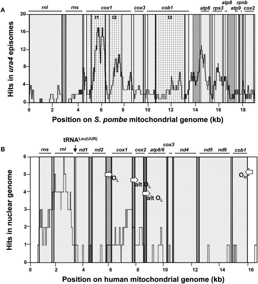 Fragile sites are present in mitochondrial genomes of S. pombe and human. (A) Distribution of S. pombe mtDNA sequences at repair junctions of circularized ura4 fragments. One-hundred-ninety-five mtDNA inserts (83–4004 bp) recovered in ura4 episomes were sequenced. The graph gives the number of times each nucleotide from the S. pombe mitochondrial genome was recovered in episomes. (B) Distribution of mtDNA nucleotides in the 37 human-specific NUMTs described previously (Ricchetti et al. 2004). The graph gives the number of times each nucleotide from the human mitochondrial genome was recovered in human-specific NUMTs. (OH) Heavy-strand synthesis origin; (OL) light-strand synthesis origin; (alt OL) alternative OL. In A and B: (dashed boxes) genes; (gray) tRNAs; (white) intergenic regions. Draughtboards indicate gene introns in S. pombe mitochondrial genome. Position of tRNALeu(UUR) is indicated on human mitochondrial DNA map.