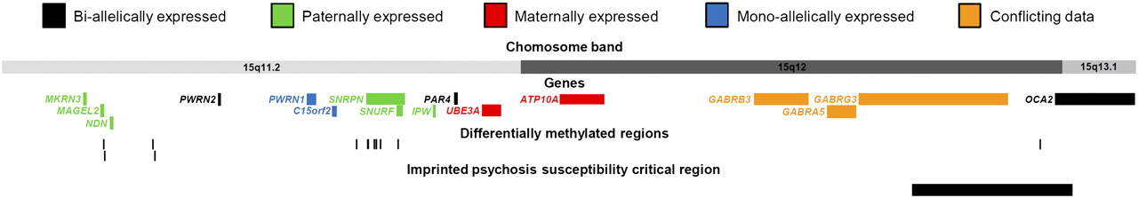 Differentially methylated regions in 15q11-q13 identified by comparative methylation profiling in patients with UPD15. Eleven of the 12 DMRs we identified lie within a 5-Mb region of proximal chromosome 15q (black bars). This includes multiple DMRs at the known imprinted genes SNRPN and MAGEL2 in addition to several novel intergenic DMRs. The DMR distal to GABRG3 lies within a 687-kb region of 15q12-q13.1 (chr15:25,059,076–25,747,771) previously defined as likely to contain an imprinted locus which, when excess maternal copies are present, confers an increased risk of psychosis in PWS patients (Webb et al. 2008). Genes are colored according to their expression status, as reported by previous studies. A dense cluster of small nucleolar RNAs and several other apparently noncoding transcripts located distal to SNRPN are not shown for clarity. The region shown is chr15:21,000,000–26,000,000.