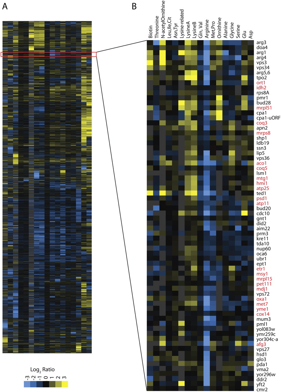 Hierarchical clustering of metabolite profiles. (A) To identify groups of related genes, we ordered 4337 yeast deletion strains using hierarchical clustering as implemented by Cluster software. Columns represent each amino acid as labeled in B. Rows correspond to the profile of a strain lacking a single gene. Yellow represents an increased metabolite level relative to the normalized average; blue represents a decreased level, as indicated in the scale (bottom left). The highlighted region is expanded in panel B. (B) A single cluster of strains showing decreased levels of arginine contains several arginine mutants. This cluster also shows increased lysine and increased citrulline. Along with the arginine mutants, this group with reduced arginine levels is enriched for mutants in mitochondrial protein genes (highlighted in red).
