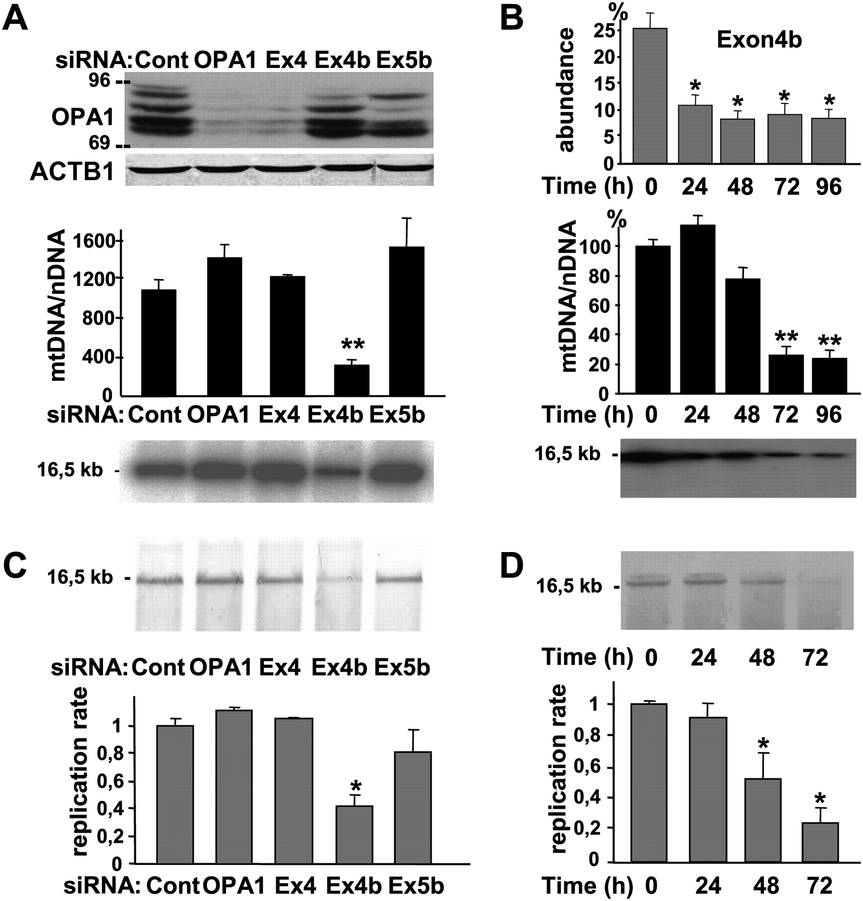 Mitochondrial genome maintenance and replication require OPA1-exon4b. (A) Western blot using OPA1 and ACTB1 antibodies of protein extracts (top), and evaluation by Q-PCR (middle) and Southern blot (bottom) of mtDNA copy number from control HeLa cells (Cont) or cells transfected for 72 h with siRNAs targeting all OPA1 mRNA (OPA1), or those including exon 4 (Ex4), 4b (Ex4b), or 5b (Ex5b), show a specific mtDNA loss in cells silenced for OPA1-exon4b transcripts. Note that because OPA1 isoforms including the exon 4b domain account for <25% of all OPA1 isoforms, their silencing can barely be detected by Western blot. (n = 6, one-way ANOVA; [**] P-value inferior to 0.001). (B) Quantification of the relative abundances of OPA1 transcripts including exon 4b (top) and of mtDNA in HeLa cells transfected by the exon 4b siRNA during a 24-h period time course reveals a delay between OPA1-exon4b silencing and the mtDNA loss, without evidencing mtDNA degradation or deletions on the Southern blot (bottom). (n = 3, one-way ANOVA; P-value inferior to 0.01 [*] and 0.001 [**]). (C) Southern–Western blot using anti-BrdU antibodies on DNA extracts (top) and quantification of the replication rate (bottom) in control HeLa cells (Cont) or cells transfected for 48 h with the siRNAs targeting all OPA1 mRNA (OPA1) or those including exon 4 (Ex4), 4b (Ex4b), or 5b (Ex5b) shows a significant 60% decrease of BrdU incorporation in mtDNA, in cells silenced for OPA1-exon4b (n = 3, one-way ANOVA; [*] P-value inferior to 0.01). (D) Southern–Western blot of DNA extracts (top) and quantification of the replication rate (bottom) from HeLa cells transfected with the exon 4b siRNA for the indicated times illustrates a progressive inhibition of mtDNA replication starting readily after OPA1-exon4b silencing (n = 3, one-way ANOVA; [*] P-value inferior to 0.01).