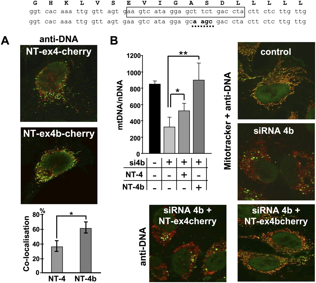 OPA1-exon4b N terminus colocalizes with mtDNA and rescues exon 4b silencing. The human exon 4b peptide sequence (top) stands above the corresponding wild-type and mutagenized exon 4b nucleotide sequences. The sequence targeted by exon 4b siRNA is boxed on the wild-type sequence, and the mutagenized sequence used in expression vectors to prevent cross-reaction with the siRNA 4b is underlined on the bottom sequence. (A) Merged Cherry and anti-DNA fluorescences from HeLa cells transfected by the plasmids expressing NT-OPA1-exon4-cherry (top) and NT-OPA1-exon4b-cherry (bottom) show the preferential colocalization of the mitochondrial nucleoid with the NT-OPA1-exon4b peptide. (Bottom) Quantification of the colocalization in both conditions (n = 12 cells, t-test; [*] P-value inferior to 0.01). (B, left) Quantification of mtDNA copy number from wild-type cells, cells transfected by the exon 4b siRNA (si4b), or cells transfected with exon 4b siRNA plus a plasmid expressing NT-OPA1-exon4 (si4b + NT-4) or NT-OPA1-exon4b (si4b + NT-4b) illustrates the full recovery of mtDNA abundance in cells transfected by exon 4b siRNA and expressing the NT-OPA1-exon4b peptide and partial recovery in those expressing the NT-OPA1-exon4 peptide. (n = 3, one-way ANOVA; P-value inferior to 0.01 [*] and 0.001 [**]). (Right) Merged fluorescence pictures using anti-DNA and Mitotracker, showing the mtDNA distribution in control and exon 4b–silenced HeLa cells. (Bottom) Merged fluorescences of antiDNA and Cherry protein in cells cotransfected by the exon 4b siRNA and the NT-OPA1-exon4 (left) and NT-OPA1-exon4b encoding plasmids, showing the rescue of mtDNA distribution in cells expressing NT-OPA1-exon4b.