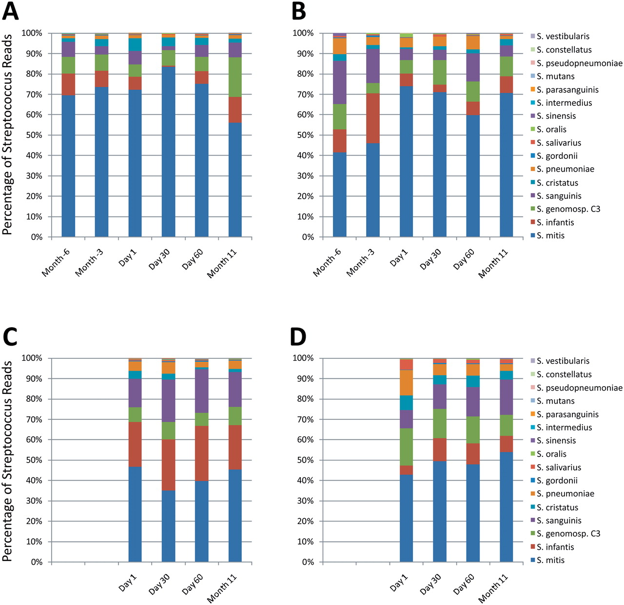 Streptococcus species in human subject saliva at each time point. Each species is displayed as a percentage of the total number of OTUs identified taxonomically to the Streptococcus genus. (A) Subject #1; (B) subject #2; (C) subject #3; (D) subject #4.