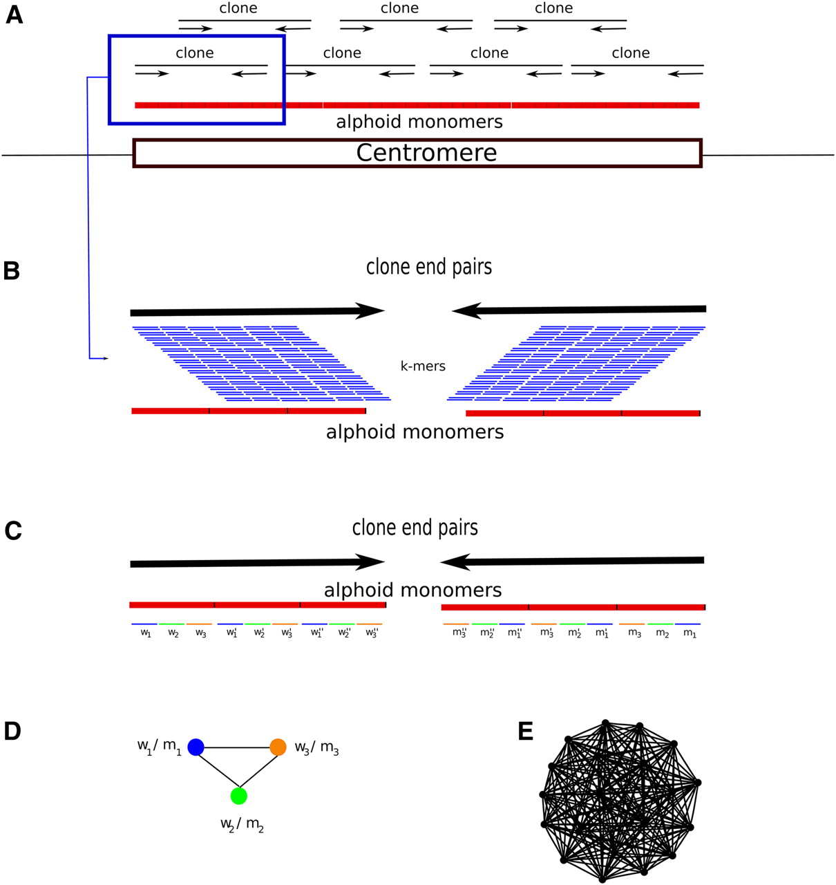 The RepeatNet algorithm. (A) The layout of the alphoid repeat array in the centromere and the paired-end inserts in the centromeric region is shown. Note that since the centromere is larger than the inserts (fosmids, plasmids, BACs, or short inserts used in next-generation sequencing), both ends of the same insert contain alphoid sequence. (B) Close-up view of a paired-end insert over the alphoid repeat array. We also show all possible k-mers (sliding by 1 bp) that can be generated from the reads. (C) The ideal case for the k-mer structure in the end sequences. When both ends of a paired-end insert contain alphoid sequence, we expect that the k-mers in the forward end will be represented with their reverse-complement counterparts in the reverse end. For simplicity, we show only the nonoverlapping k-mers; however, RepeatNet considers all possible overlapping k-mers. In this figure, w1-m1, w2-m2, w3-m3, w′1-m′1, w′2-m′2, w′3-m′3, w′′1-m′′1, w′′2-m′′2, w′′3-m′′3 are the k-mer pairs that are reverse complements of each other, and the triplet k-mer groups (w1-w′1-w′′1), (w2-w′2-w′′2), (w3-w′3-w′′3) are highly similar k-mers. In the case of exact repeats, these k-mers are identical. (D) Since k-mer pairs w1-m1, w2-m2, and w3-m3 exist in the same read pairs, we put an edge between the nodes that represent such k-mers. (E) The repeat graph for the ideal case of a 31-mer tandem repeat with exact repeat units is shown. This graph includes 20 vertices for 20 k-mer pairs that can be generated from a 31-mer repeat structure, and there exists an edge between all pairs of k-mers. Note that this graph is a clique of size 20. For non-ideal cases, the clique property will be lost; however, the graph will still be very dense in terms of the average degree of the vertices. RepeatNet finds such dense subgraphs of the repeat graph with a heuristic that selects the vertex with the highest degree, and other vertices that share an edge with this selected vertex. Alternatively, a maximum density subgraph algorithm can be used (Fratkin et al. 2006), though this algorithm has a high running time complexity of O[n.m.log(n2m)].