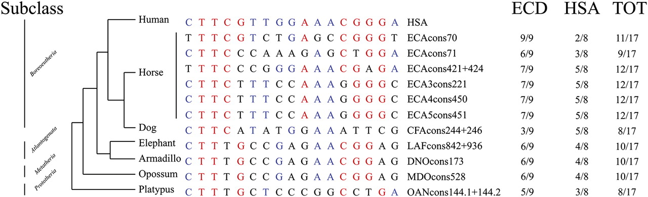 CENPB box-like motifs extracted from consensus sequences. Conserved bases in the evolutionarily conserved domain (ECD) have been reported in red, and conserved bases compared with human (HSA) other than the ECD domain are reported in blue. The number of total conserved bases is reported in last column. At left, a phylogenetic tree according to Prasad et al. (2008).