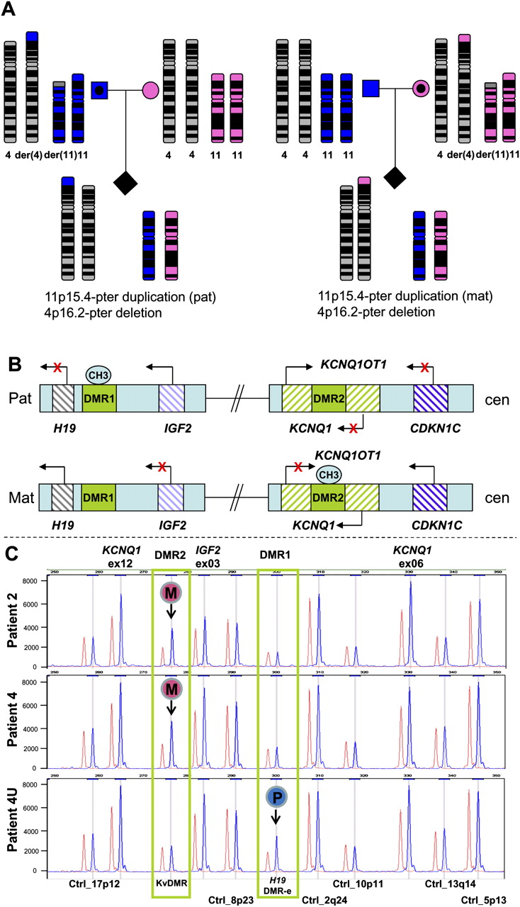 Methylation pattern and copy number analysis by MS-MLPA of patients with recurrent t(4;11). (A) Pedigrees illustrating the parental origin of the duplicated 11p material if the balanced translocation is present in the father (left), or the mother (right). (Blue) Paternal inheritance; (pink) maternal inheritance. (B) Schematic representation of the imprinted region at 11p15. The imprinted 11p15 region consists of two independent domains that are regulated by differentially methylated regions (DMR). The telomeric DMR1 is paternally methylated and regulates reciprocal expression of H19 and IGF2 genes. The centromeric DMR2 is maternally methylated and regulates expression of imprinted genes in this region including CDKN1C, KCNQ1OT1, and KCNQ1. CH3 represents the methylated allele. (C) Partial profile of MS-MLPA HhaI digestion/ligation products for patients 2, 4, and 4U (blue) compared to normal control (red). Increased peak intensities of IGF2 and KCNQ1 in patients 2, 4, and 4U indicate duplication of the 11p15 region. Gain of methylation in the HhaI sensitive DMR2 was detected in patients 2 and 4, whereas gain of methylation in the HhaI sensitive DMR1 was detected in patient 4U. The results demonstrated that maternal inheritance (M) of the duplicated 11p15 region in patients 2 and 4 and paternal inheritance (P) of the duplicated 11p15 region in patient 4U.