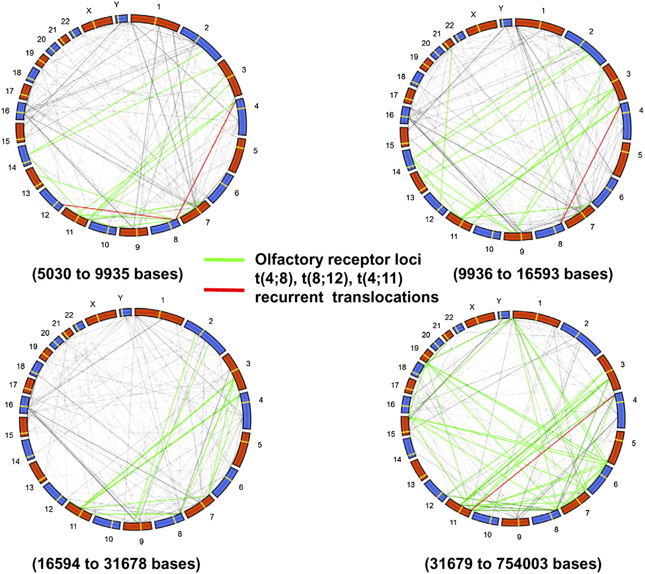 Recurrent translocation map. A global genomic view of interchromosomal LCR pairs with >5 kb in size and >94% DNA sequence identity represented by dotted lines and distribution divided into four groups based on the size of LCR. To create this plot we circularized the genome using polar coordinates. We then connected points between a pair of chromosomes linked by LCRs satisfying our size sequence identify criteria (see Supplemental Table 3). The midpoints of the LCRs were used to identify each segment with a single location on each chromosome. The red dotted lines indicate the translocations identified in our patient database, while the green dotted lines represent the olfactory receptor LCRs. (A) The size of LCR ranges from 5030 to 9935 bases in the first 25%. (B) The size of LCRs range from 9936 to 16,593 bases for the second 25% of LCRs. (C) The size of LCRs range from 16,594 to 31,678 bases for the third 25% of LCRs. (D) The size of LCRs range from 31,679 to 754,003 bases for the final 25% of LCRs.