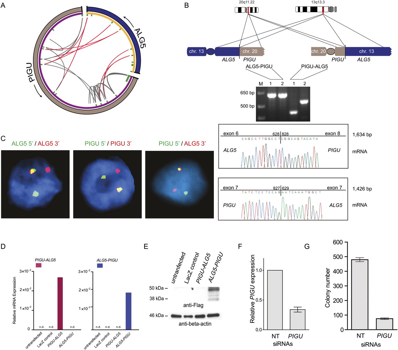 Characterization of the reciprocal balanced translocation event involving PIGU and ALG5. (A) Circos plot of ALG5–PIGU rearrangement. In the outer ring, (gray) chromosome 20 and (blue) chromosome 13. Genes are represented in purple (PIGU) and orange (ALG5) on the inner ring. Within the inner ring, each line denotes paired-end reads with either both ends mapping to PIGU (gray) or one end mapping to PIGU and the other end to ALG5 (red). The red lines connect 5′ ALG5 to 3′ PIGU and vice versa, thereby indicating a balanced translocation event. (B) Experimental validation of the two resulting gene fusions by RT-PCR and subsequent Sanger sequencing of the resulting PCR products. Two different primer pairs were used for verification of each gene fusion transcript indicated as 1 and 2. (C) FISH validation of the ALG5–PIGU fusion in the index case by break-apart assays (left and middle) and a fusion assay (right). (D) Expression of ALG5–PIGU and PIGU–ALG5 messages, as determined by quantitative PCR following transfection of the indicated constructs in HEK293 cells. (E) Immunoblot analysis on the transfected HEK293 cells showing protein expression only in ALG5–PIGU transfected cells. (F,G) LNCaP cells were treated with nontargeting (NT) siRNAs or siRNAs against PIGU to assay for effect of anchorage-independent growth in soft agar. (F) Bar graph showing expression of PIGU after siRNA treatment. (G) LNCaP cells treated with PIGU siRNAs show reduced colony formation ability.