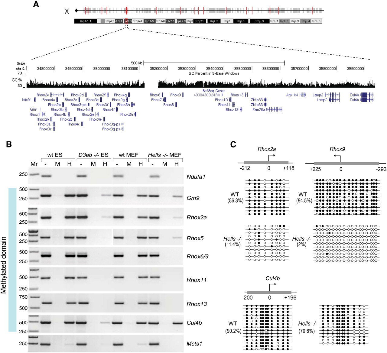 DNA methylation of Rhox gene cluster is LSH-dependent. (A) Schematic representation of the Rhox gene cluster and neighboring genes on mouse chromosome X A.33. The light-colored genes are provisional or predicted RefSeq. The GC content of the region is shown as a histogram. (B) DNA methylation at the promoters of the Rhox genes and genes neighboring the Rhox cluster was examined by PCR following digestion with methylation-sensitive HpaII (H) or methylation insensitive MspI (M) restriction enzymes of genomic DNA from wild-type and Dnmt3a/3b−/− ES cells as well as wild-type and Hells−/− MEFs. “−” represents undigested DNA. “Mr” is a DNA size marker. (C) Bisulfite DNA sequencing confirms lack of DNA methylation at Rhox2a and Rhox9 promoters, but not at the Culin4b promoter in Hells−/− compared with the wild-type MEFs. Methylated CpGs are shown as black circles. The average percentage of methylated CpGs relative to the total number of CpGs investigated by bisulfite DNA sequencing for any given sequence is shown in parentheses.