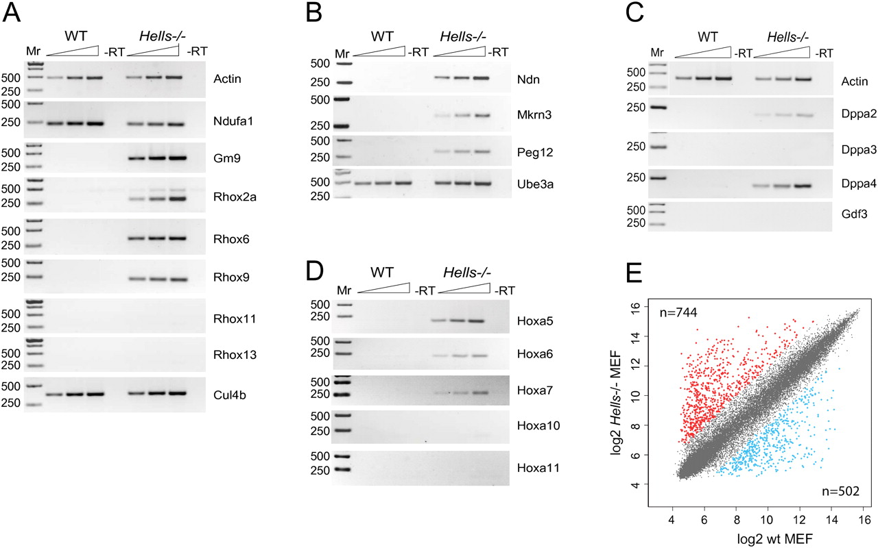 Changes in gene expression in Hells−/− MEFs. (A) RT-PCRs detect expression of the normally silenced Gm9 and Rhox genes in Hells−/− MEFs. (B) Expression of the imprinted genes Mkrn3, Ndn, and Peg12 of the mouse PWS imprinted locus on chromosome 7 in Hells−/− and wild-type MEFs. Ube3a is a neighboring imprinted gene. (C) Pluripotency markers Dppa2 and Dppa4, but not Dppa3 and Gdf3, are expressed in Hells−/− MEFs. (D) As previously reported (Xi et al. 2007), some Hox genes, including Hoxa5, Hoxa6, and Hoxa7, are aberrantly expressed in Hells−/− MEFs. In A–D, the triangles represent an increasing concentration of cDNA. “Mr” is a DNA size marker. (E) Global changes in gene expression in Hells−/− MEFs compared with wild-type controls as detected by expression microarrays. “n” indicates the number of up-regulated fourfold or more (log2 Hells−/−/wild type ≥ 2) and down-regulated fourfold or more (log2 wild type/Hells−/− ≥ 2) transcripts. Log2 values of normalized intensities for Hells−/− MEFs (y-axis) versus wild-type MEFs (x-axis) are shown.