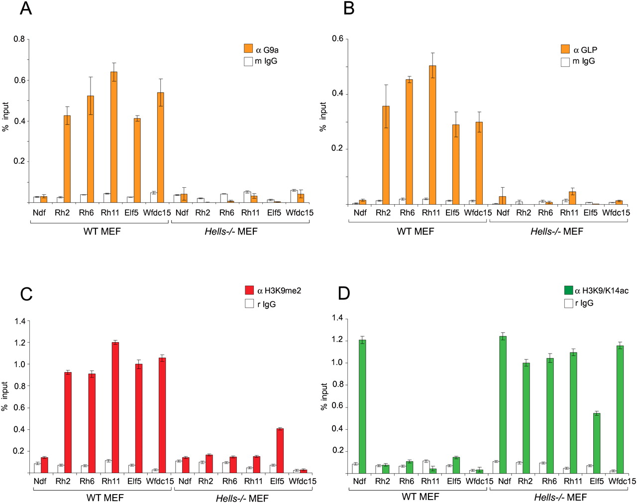 H3K9me2 and G9a/GLP are absent from Rhox and other promoters in Hells−/− MEFs. (A,B) ChIP experiments detect loss of G9a and GLP binding (gray bars) from the promoters of Rhox2, Rhox6/9, Rhox11, Elf5 and Wfdc15 in Hells−/− compared with wild-type (WT) MEFs. The promoter of the expressed Ndufa1 gene was used as a control. Total mouse IgG served as a nonspecific control antibody (white bars). (C,D) ChIP assays detect loss of H3K9me2 (C) and gain of H3 K9/K14 acetylation at Rhox, Elf5, and Wfdc15 promoters in Hells−/− MAFs. All graphs show the average enrichment ± SD from two independent chromatin preparations and ChIP experiments performed and analyzed in triplicate.