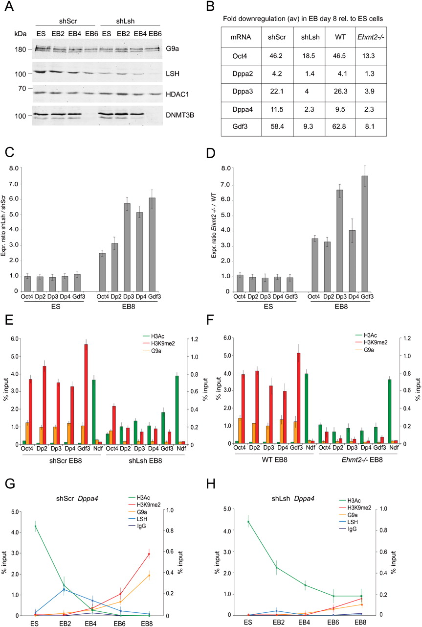 LSH is required for recruitment of G9a to promoters of pluripotency genes during differentiation. (A) Western blots display G9a, LSH, HDAC1, and DNMT3B protein levels in shScr and shLsh ES cells during differentiation to embryoid bodies (EB) at days 2, 4, and 6. (B) Fold down-regulation of pluripotency markers mRNA as detected by qRT-PCR in wild-type and mutant EBs at day 8 relative to ES cells. (C) mRNA expression ratios relative to GAPDH of pluripotency genes in shScr versus shLsh ES cells and EBs at day 8 of differentiation indicate that these genes have equal expression in shScr and shLsh ES cells, but higher expression in shLsh EB8 relative to shScr EB8. (D) mRNA expression ratios relative to GAPDH of pluripotency genes in wild-type versus Ehmt2−/− (G9a-null) ES cells and EB at day 8. (E) ChIP for acetylated H3, H3K9me2, and G9a at promoters of pluripotency genes in shScr and shLsh EBs at day 8 of differentiation. Ndf is a control promoter of constitutively expressed Ndufa1 gene. (F) ChIP for acetylated H3, H3K9me2, and G9a at promoters of pluripotency genes in wild-type and Ehmt2−/− EBs at day 8 of differentiation. In E and F, the scale on the left applies to H3ac and H3K9me2; the scale on the right applies to G9a. (G,H) ChIP enrichment profiles of acetylated H3, H3K9me2, LSH, and G9a at the promoter of the Dppa4 gene during differentiation of shScr and shLsh ES cells. The scale on the left applies to H3ac and H3K9me2; the scale on the right applies to LSH, G9a, and the nonspecific IgG.