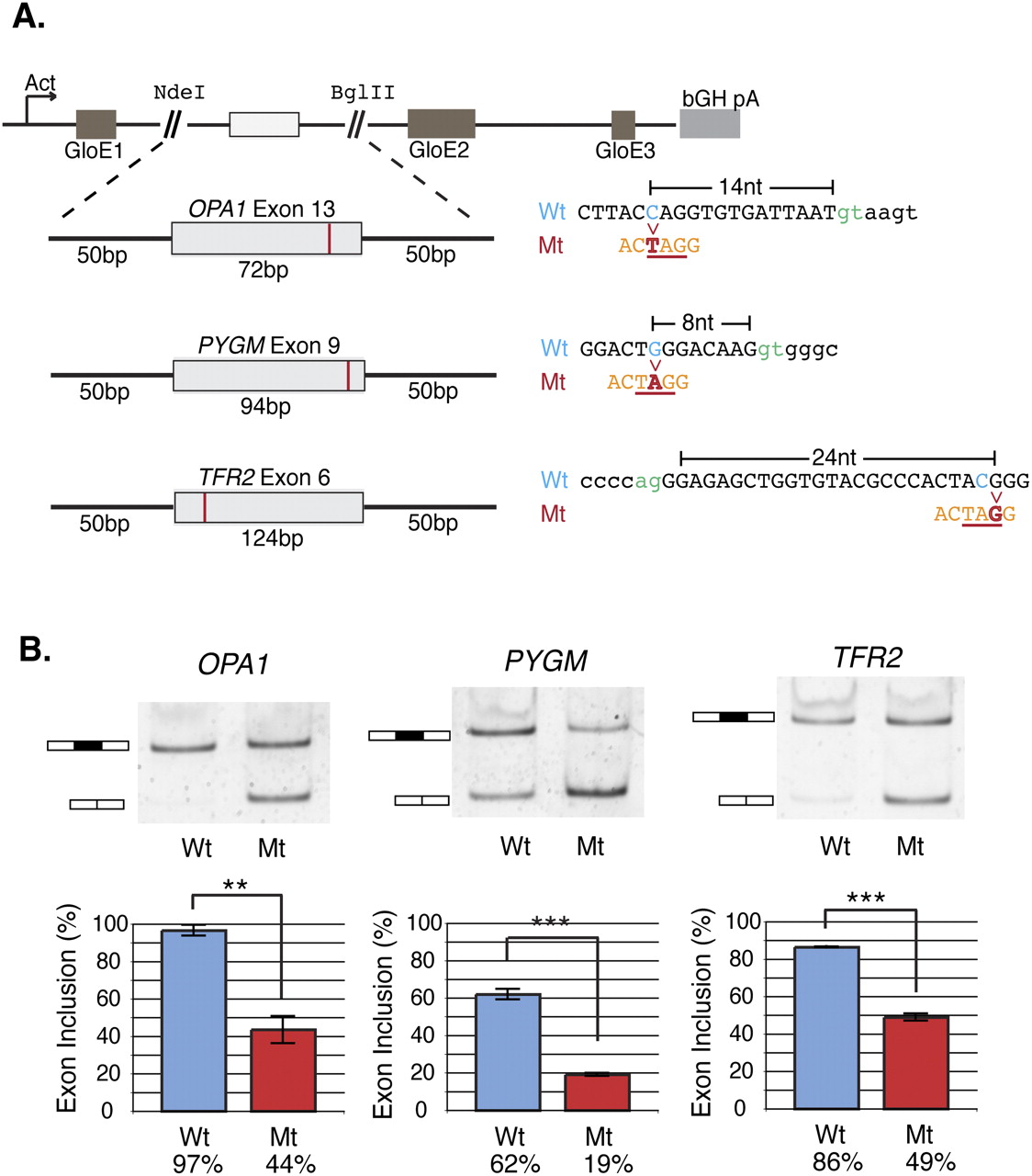 Validation of mutations creating the enriched silencer ACUAGG using the beta-globin splicing reporter. (A) Splicing reporter constructs created from matched pairs of wild-type (Wt) or mutant (Mt) alleles that give rise to a gain of the ACUAGG silencer in constitutive exons in three different disease genes: OPA1, PYGM, and TFR2. GloE1, GloE2, and GloE3 designate exons 1–3 of beta-globin. The polyadenylation signal from the bovine growth hormone 1 gene is indicated by bGH pA. (Blue) Wild-type allele; (red) the mutant; (orange) the silencer sequence created by the mutation. (B) HeLa cells were transiently transfected in triplicate with both wild-type (Wt) and mutant (Mt) alleles. Twenty-four hours after transfection, cells were treated with emetine to inhibit NMD, RNA was harvested, and the splicing efficiency was determined by RT-PCR and visualized using 6% non-denaturing (29:1) polyacrylamide gel electrophoresis (PAGE). The graphs depict mean exon inclusion quantified using an Agilent 2100 Bioanalyzer with standard error bars (see Methods). Statistical hypothesis testing on means was executed using a Welch t-test for normal data with unequal sample size and variance using α-values of (*) 0.05, (**) 0.01, and (***) 0.001.