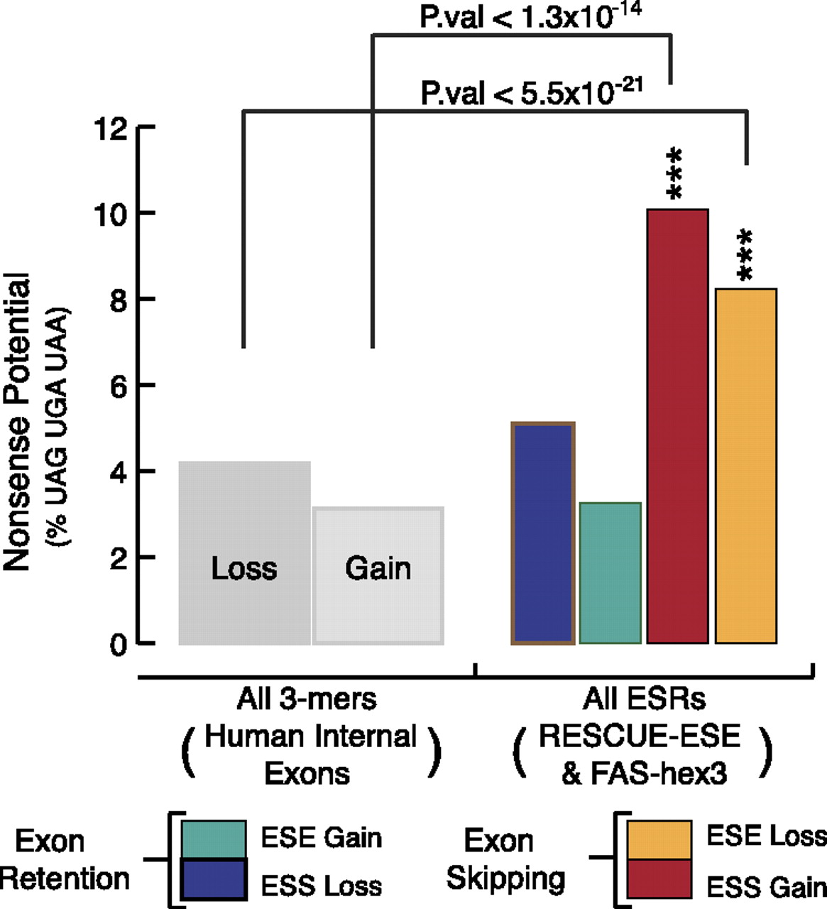 An overview of the nonsense codon sequence bias in exonic splicing regulators. Bars correspond to the nonsense-coding potential of ESR loss or gain, the proportion (expressed as a percentage) of 3-mers matching UAG, UGA, or UAA out of total 3-mers. For ESR loss, this was calculated via simulated mutation based on HGMD transition/transversion probabilities (Supplemental Fig. 2). For all human internal exonic 3-mers, the nonsense-coding potential was calculated using the same algorithm as the ESRs, except using a set of all human internal exonic sequences instead of ESR hexamers. The frequencies were normalized, and the values for the data given for ESR loss or gain were analyzed statistically (P-values from χ2 goodness-of-fit test) using an α-value of (***) 0.001.