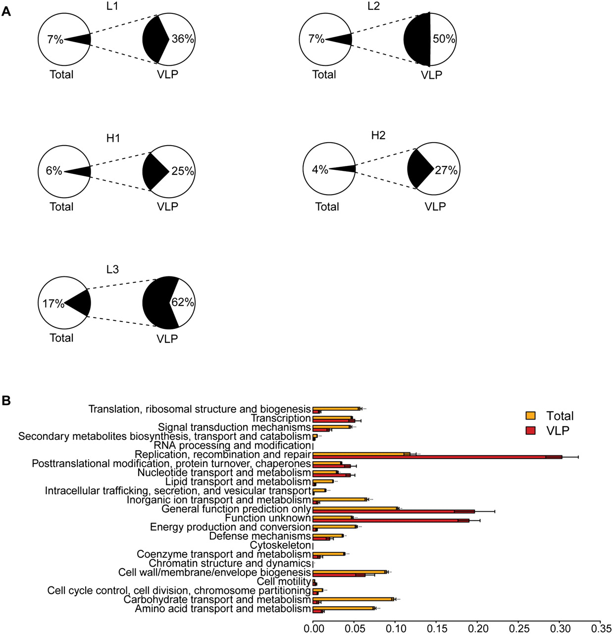 Comparison of gene content in total microbial communities and VLP communities. (A) The proportions of total genes identified in shotgun metagenomic analysis of total stool DNA (left) is compared with genes in VLP communities (right). (B) VLP DNA encodes biochemical functionality that is markedly different from the total microbiome. Function annotation was performed according to comparison to the COG database (Tatusov et al. 2003). The proportion of reads from each assembled data set that fall within an ORF of the indicated annotation are plotted on the x-axis (mean ± SE).