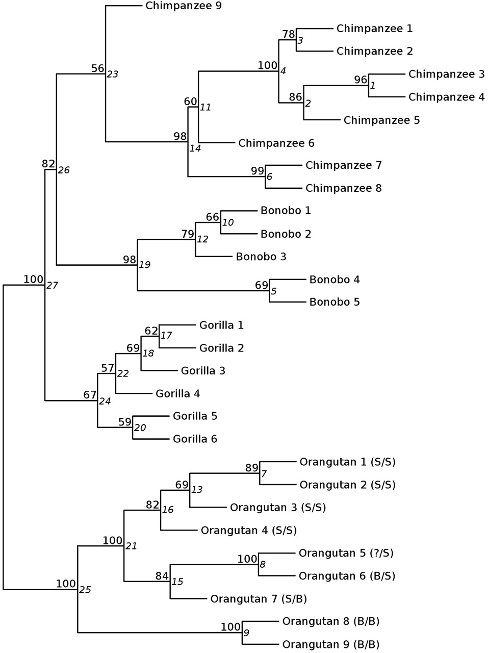 CNVR clustering tree. Dendrogram showing individuals clustered on the basis of their CNVR similarities. Numbers on the upper lefthand side of each node indicate bootstrap values. Numbers on the righthand side of each node (in italic) are edge numbers. S and B next to the orangutan individuals stand for Sumatra or Borneo, the ancestral geographical origin of the samples. The first letter represents the origin of the sample and the second letter is for the origin of the reference. Individuals are called by short names that are defined in Supplemental Table S1.