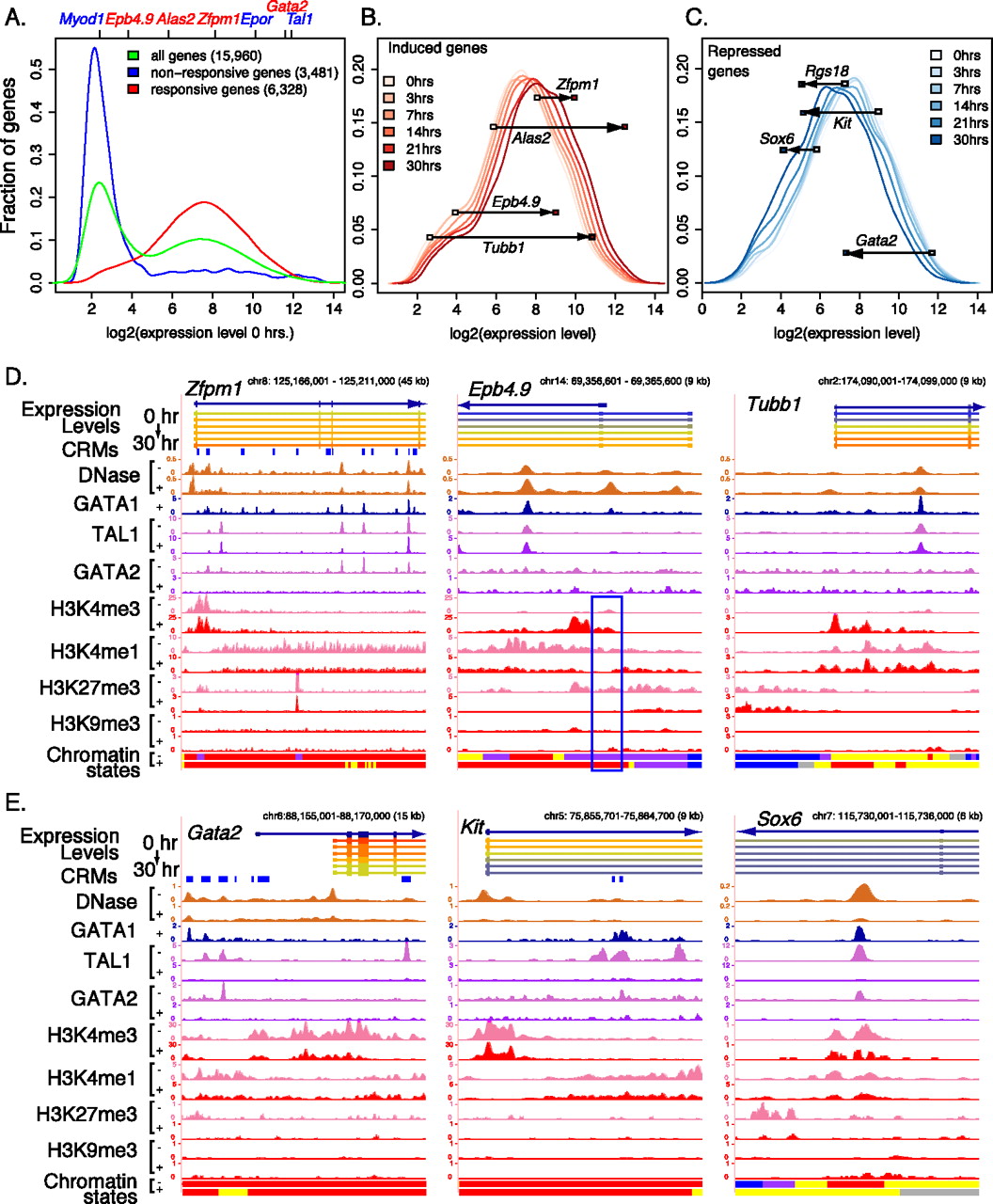 Distributions of expression and response of erythroid genes. (A) Distributions of numbers of genes, binned by their initial expression level prior to activation of GATA1-ER. (B,C) Distribution of numbers of induced genes (B) and repressed genes (C) by expression levels, over the time course of differentiation after activation of GATA1-ER. (D,E) Epigenetic features around examples of induced and repressed genes, respectively. Each panel shows the gene (or portion thereof), a color representation of the expression level (low to high is blue to red), erythroid CRMs where known, and signal tracks for the sequence census data on transcription factor occupancy, DNase HSs, and histone modifications. Other conventions are the same as in Figure 1.