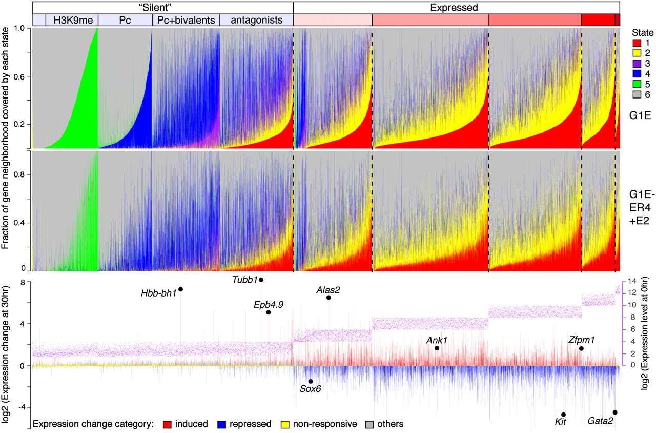 Coverage of gene neighborhoods by chromatin states. The fraction of each gene neighborhood covered by each chromatin state (red for the H3K4me1,3-dominated state 1, yellow for the H3K4me1-dominated state 2, purple for the H3K4me1,K27me3-dominated state 3, blue for the H3K27me3-dominated state 4, green for the H3K9me3-dominated state 5, and gray for the low signal state 6) is graphed for G1E cells (top panel) and G1E-ER4+E2 cells (middle panel). For each gene, the expression level is shown as a purple dot, and the change in expression during differentiation is shown as a bar in the third panel (red for induced, blue for repressed, yellow for no change, and gray for other). The gene neighborhoods are partitioned by their level of expression into bins covering two log2 expression levels, except the first bin, which includes all levels less than log2 of 4. Within each expression bin, the genes are ordered first by coverage by state 1 and then by coverage by state 3, state 4, state 5, and state 6.