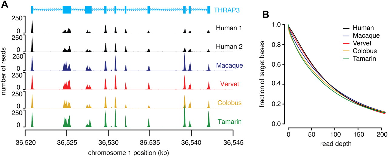 Read depth of targeted regions. (A) An example of sequence capture. Read depth for a region on chromosome 1 encompassing the gene THRAP3 (CCDS405.1) from two human HapMap samples (Human 1: NA12878 and Human 2: NA18967) and four non-human primate samples (macaque, vervet, colobus, and tamarin). (B) Cumulative coverage of all targeted bases from one lane of paired-end 76-bp reads mapped to the human reference genome using cross_match for human (NA12878), macaque, vervet, colobus, and tamarin.