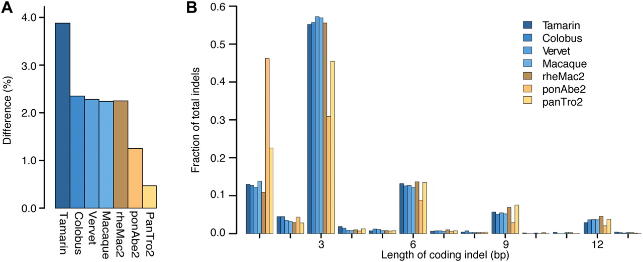 Sequence differences and indel lengths in protein-coding regions. (A) Coding sequence differences relative to the human reference genome for each assembled exome and non-human primate reference genome, calculated from the 9,106,235 sites that are high-quality in all species. (B) Distribution of coding indel lengths from the 4637 gene alignments where at least 75% of sites have high-quality sequence in all species. All indels are relative to the human reference genome. Low-quality indels are not included unless their read depth is ≥4 or they are confirmed by a high-quality indel in another species. Lengths from indels <15 bp apart are combined to account for uncertainty in the alignments. Indel lengths from the exome assemblies of macaque, vervet, colobus, and tamarin (blue); indel lengths from the reference genomes of chimpanzee (panTro2), orangutan (ponAbe2), and macaque (rheMac2) (yellow).