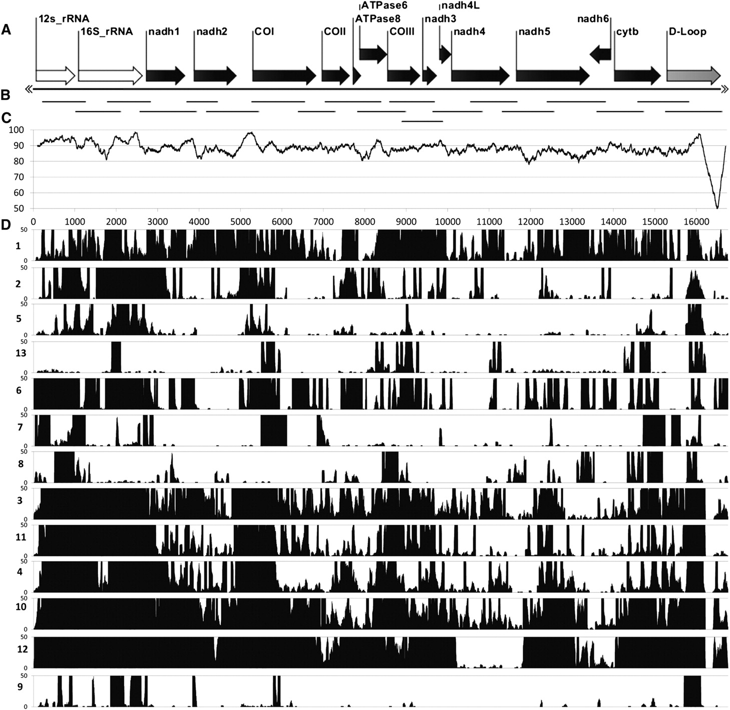 Distribution and depth of coverage of captured mtDNA fragments from each Sunda colugo museum specimen, displayed relative to the reference colugo mtDNA genome. (A) Reference colugo genome, AJ428849, depicted horizontally with gene annotations displayed except tRNA genes. (B) Distribution of mtDNA probe fragments produced by PCR. (C) Plot of DNA sequence identity between two full-length mitochondrial reference genomes (AJ428849, Borneo; AF460846, West Java) calculated in overlapping, 200-bp sliding windows. (D) Histogram showing distribution of captured mtDNA sequence fragments for the 13 museum specimens (labeled on left side by ID number in Table 1), relative to the reference genome. Only coverage from 0× to 50× is shown for clarity, although most individuals have substantially higher coverage across the genome (Supplemental Fig. 6).