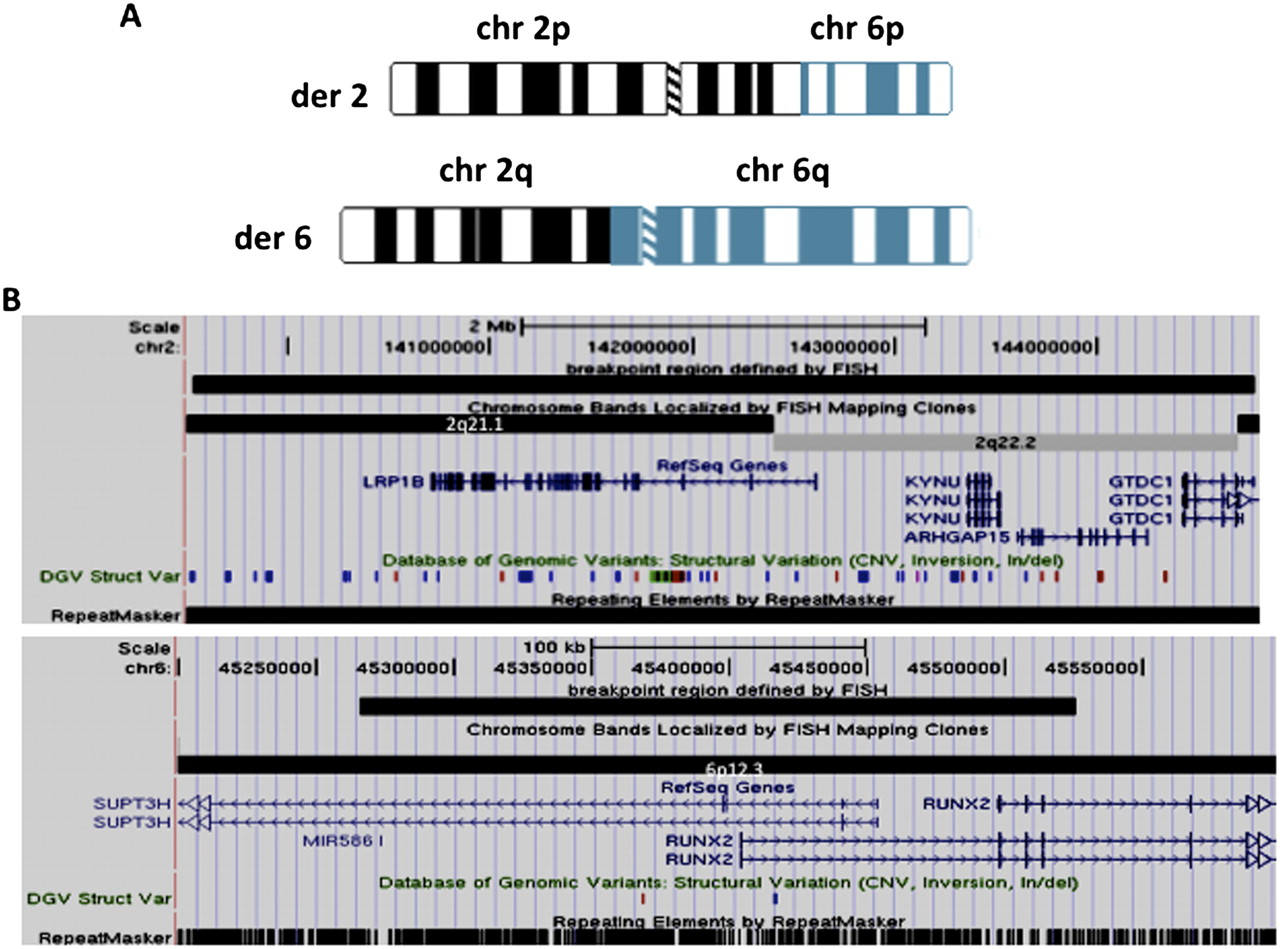 (A) Ideograms showing derivative chromosomes 2 and 6. (B) UCSC Genome Browser information around the breakpoint regions with the same conventions as described for Figure 1.