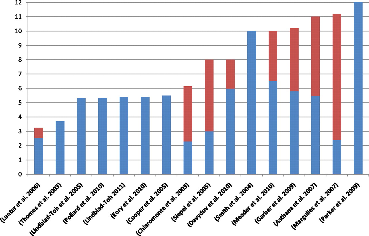 Estimates of αsel from 16 studies ranked by increasing values. Lower and upper bound values are indicated in blue and red, respectively.