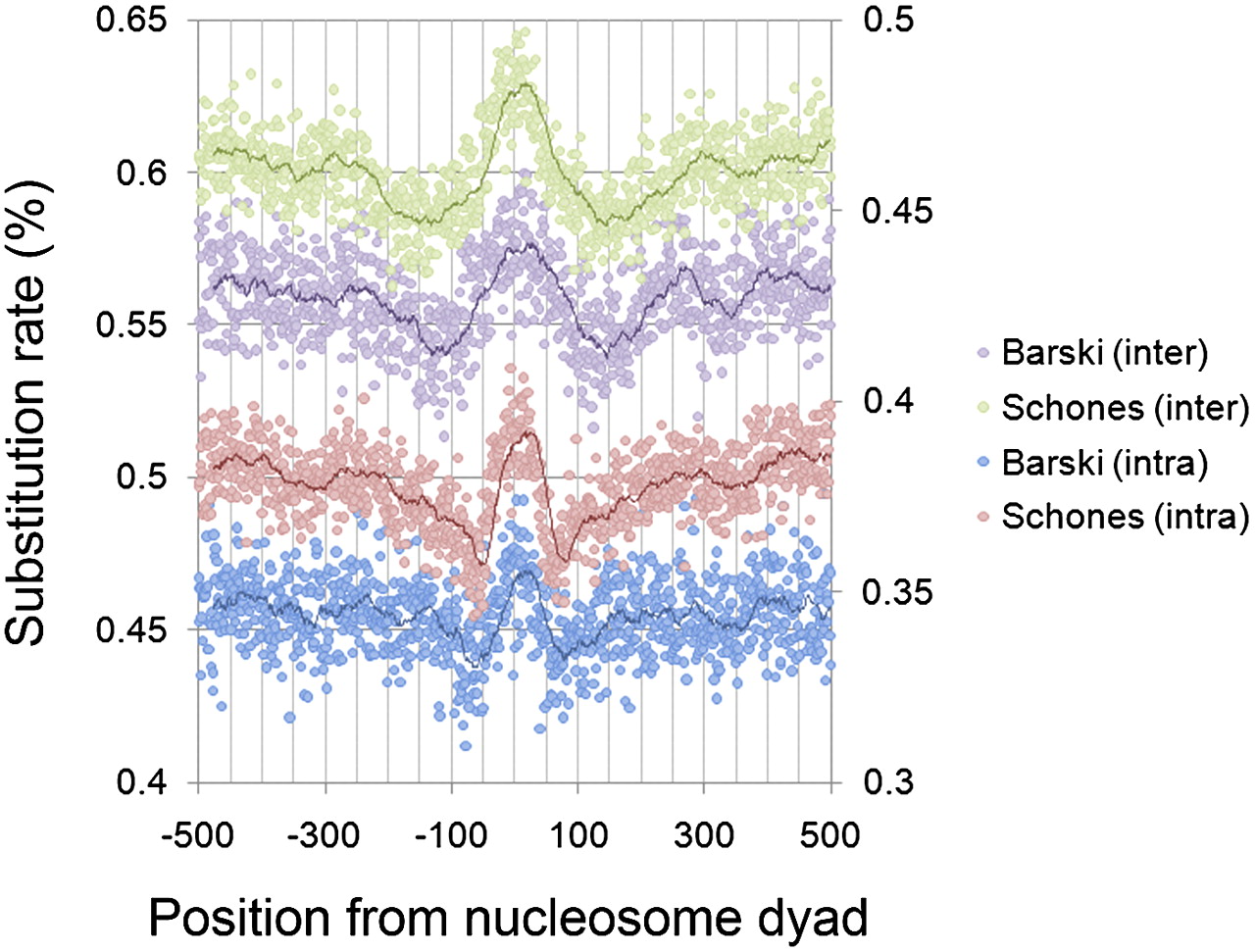 Human lineage-specific intra- and interspecies divergence rates around nucleosome dyads. Rates of intraspecies divergence are plotted on the secondary, right-hand y-axis, interspecies divergence on the primary, left-hand axis. Solid trend lines correspond to a sliding window size of 25 bp around each position. Nucleosome positioning data were derived independently from the Schones et al. (2008) and Barski et al. (2007) data sets.