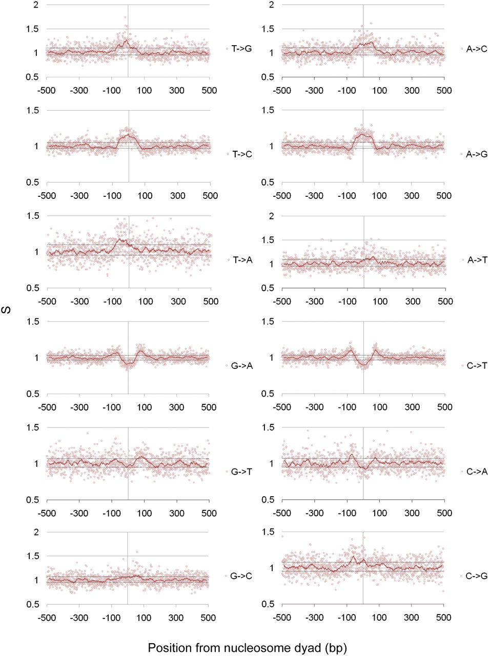 Rates of selection in and around nucleosome dyads. Ratios of background corrected inter- and intraspecies divergence rates plotted against position from nucleosomal dyad (Sx→y scores). Dotted horizontal lines correspond to an uncorrected P-value of 0.004 (corrected P-value of 0.05). Nucleosome positioning data were derived from the Schones et al. (2008) data set.