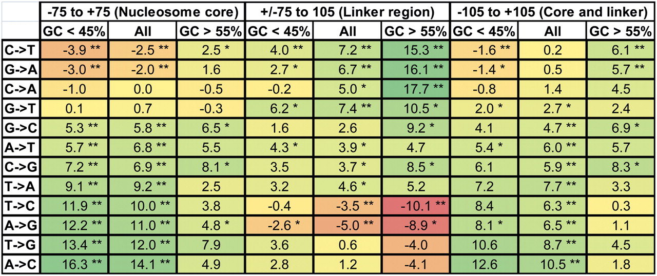 Deviation of interspecies divergence rates from flanking rates in and around nucleosomes and at different flanking GC compositions. The percentage of enrichment (or depletion) of flanking corrected interspecies rates of changes with respect to corresponding observed rates of intraspecies change. Significantly elevated or depleted levels are indicated by * (uncorrected P-value of 0.05) and ** (uncorrected P-value of 0.00046, corrected P-value of 0.05). Nucleosome positioning data were derived from the Schones et al. (2008) data set.