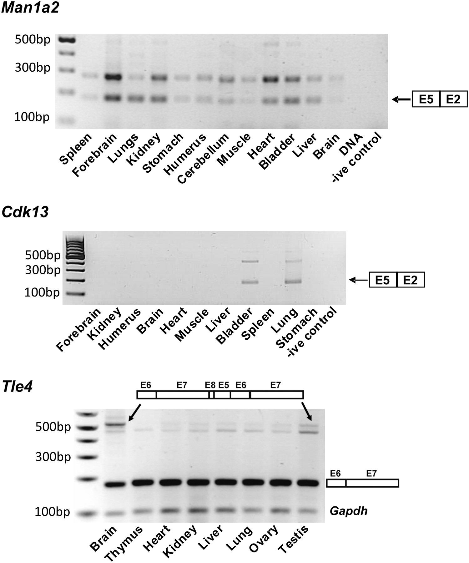 RT-PCR amplification of murine PTES products corresponding to known human structures. The amplicon corresponding to the expected PTES structure is highlighted in each case. The additional amplicons seen in panels 1 and 3 are the expected size for murine orthologs of additional human products (MAN1A2 E6-E2, Supplemental Table S6; TLE4 E8-E5, GenBank accession no. HQ283388). For Tle4, a Gapdh loading control was included. For details of primers and amplicons, see Supplemental Table S6.