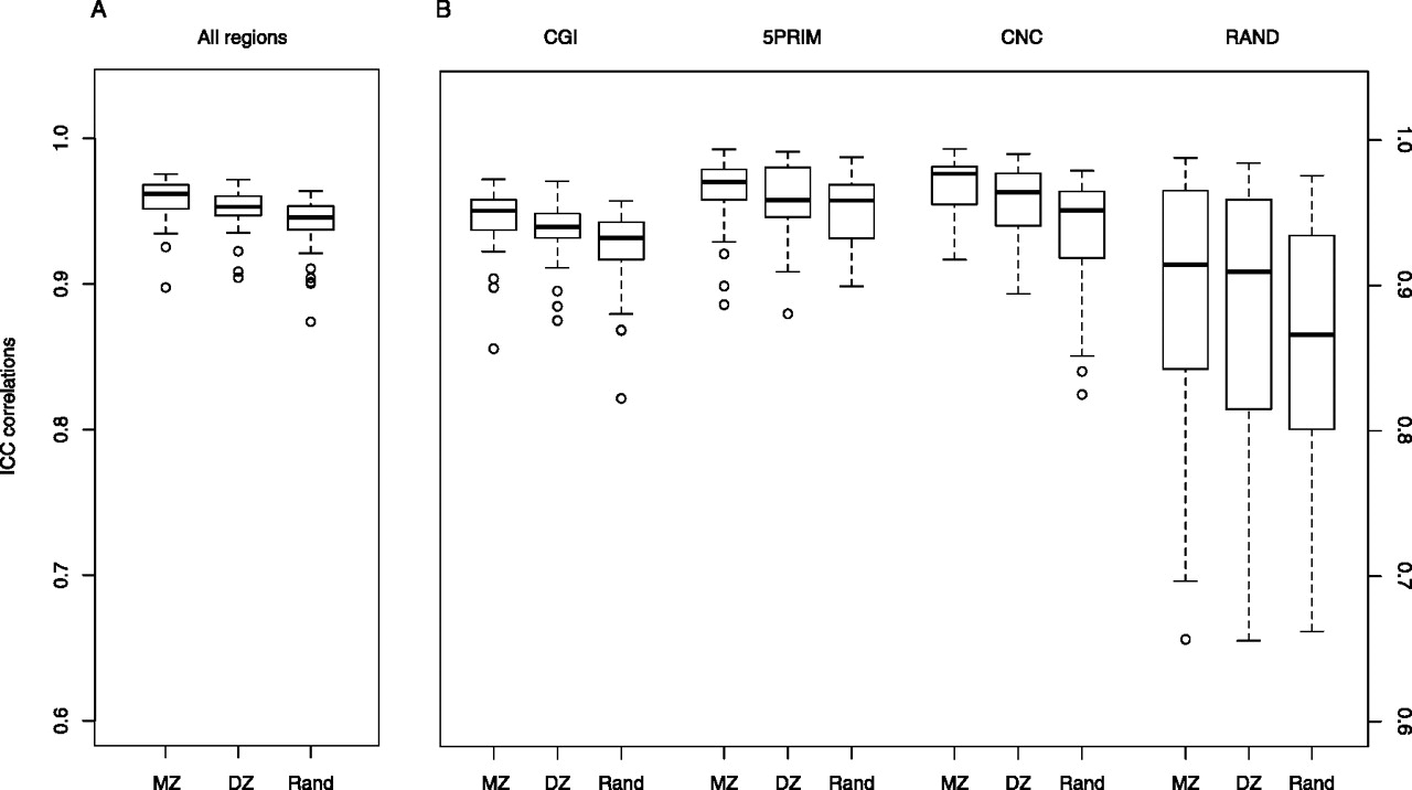 Box plots displaying intra-class correlations of DNA methylation overall (A) and in the different region types (B) calculated for MZ, DZ, and RZ. The correlations are computed for each twin pair separately, as correlations between all methylation values over all amplicons and CpGs for that twin pair.